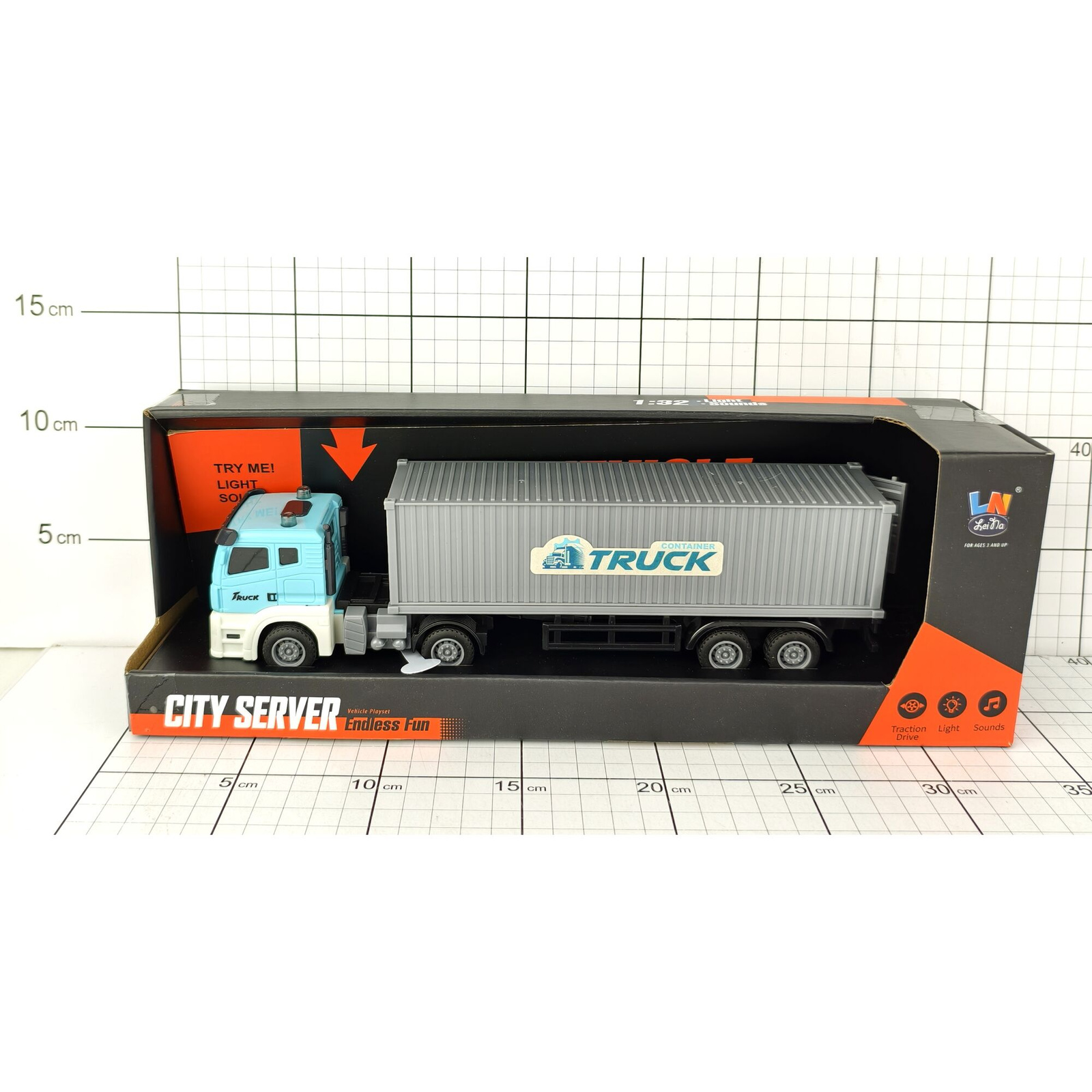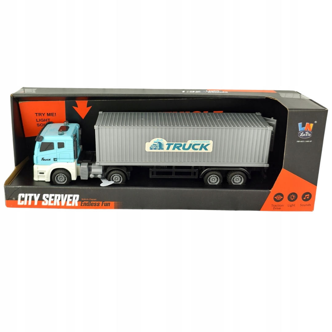Большая модель грузовика с полу -переоборудованием является идеальным предложением для детей, которые любят реалистичные транспортные средства. Легкие и звуковые эффекты запускаются на кнопке.