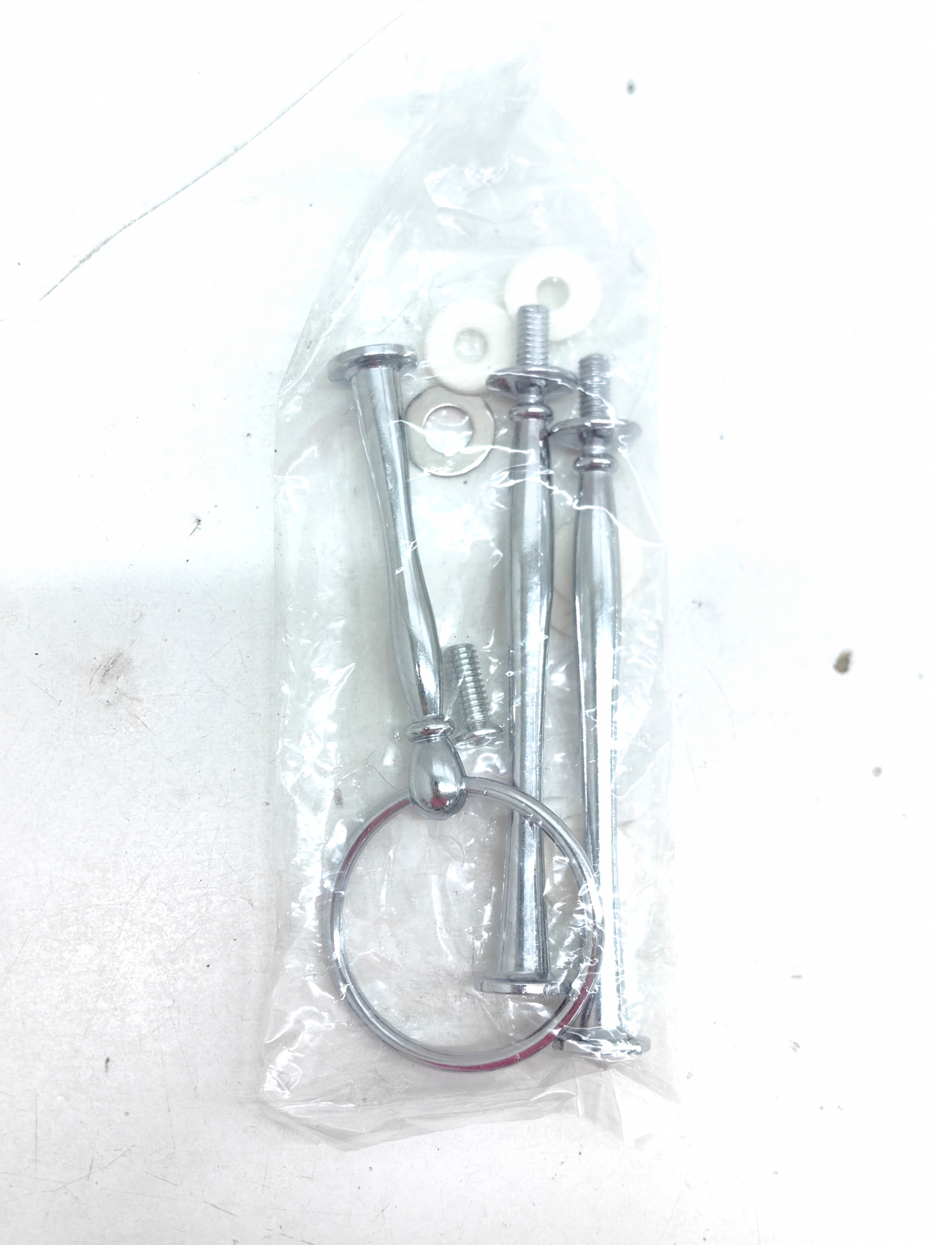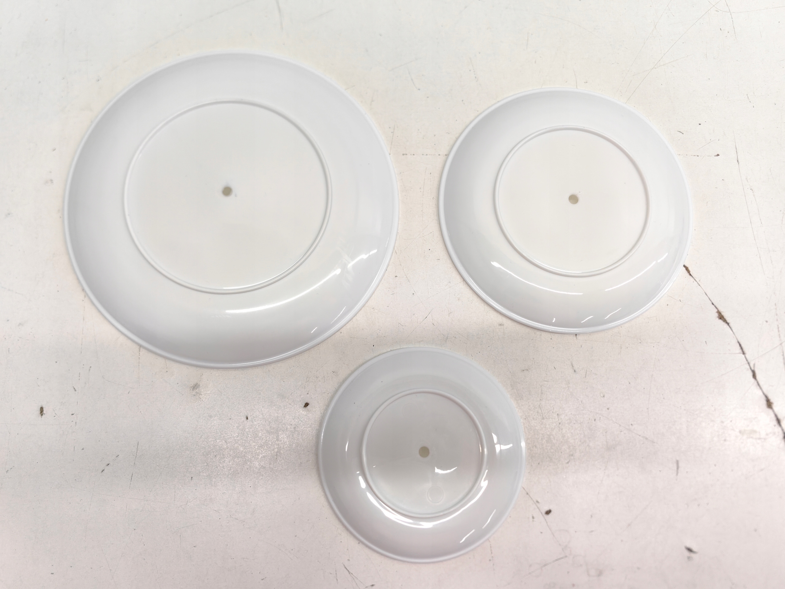 Патера для пирога состоит из трех уровней, которые состоят из белых пластиковых пластин. С диаметром 21,5 см, 19 см и 14,5 см и общей высотой 34 см, включая плоскогубцы для подачи.