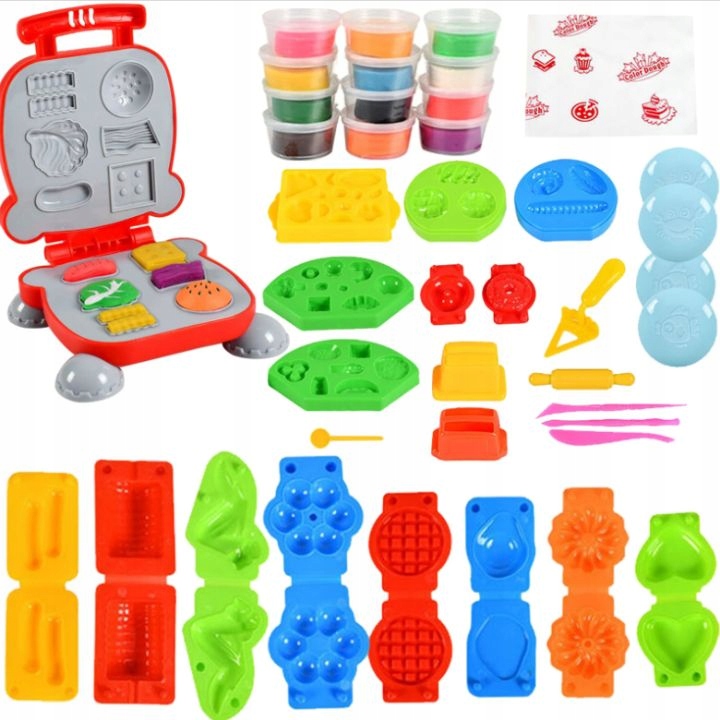 Содержит 12 разноцветных тортов, 16 форм для штамповки, машинку для гамбургеров, 5 дополнительных инструментов, 4 тарелки и водонепроницаемый коврикa. Полный комплект обеспечивает много часов бесконечного веселья без необходимости покупать дополнительные элементы.