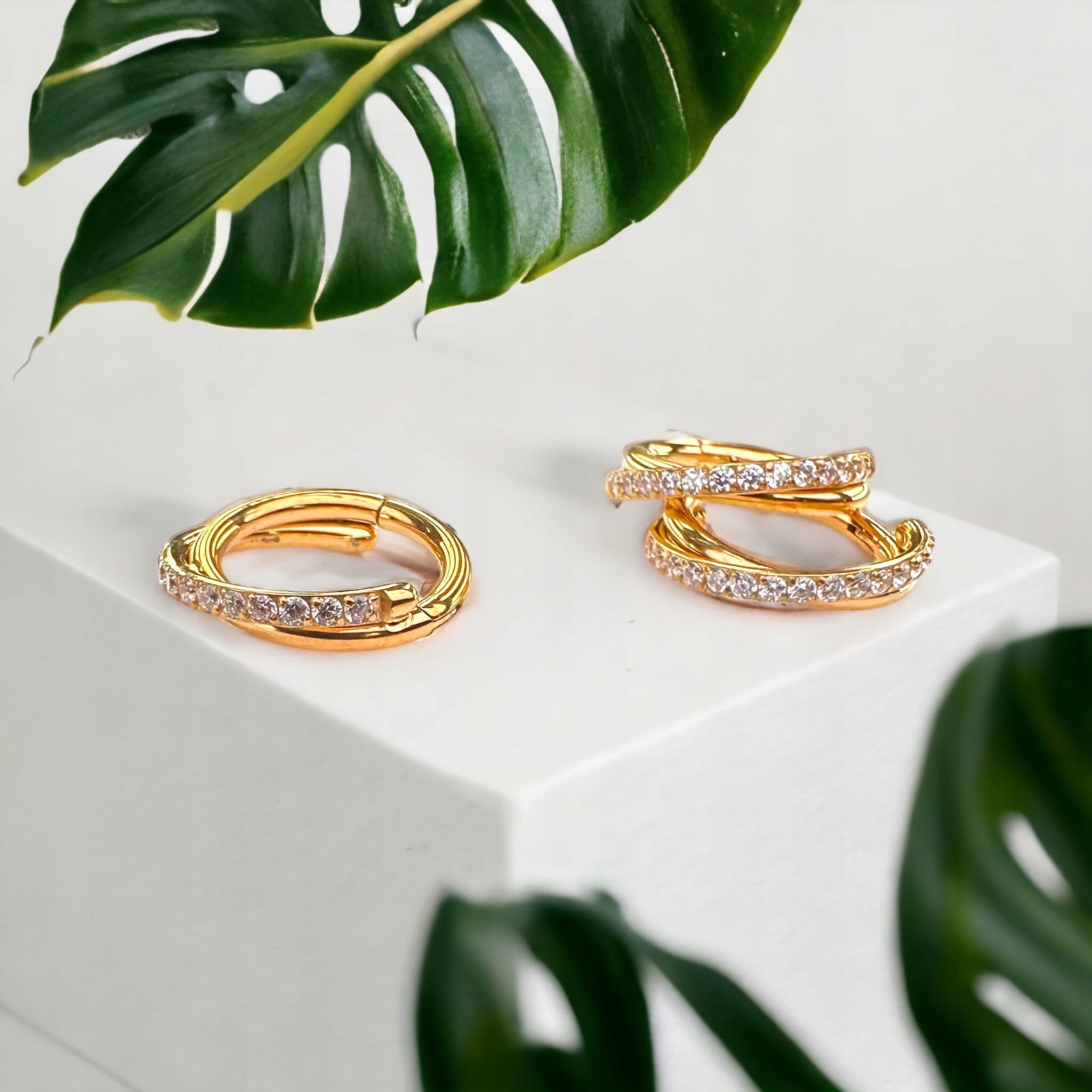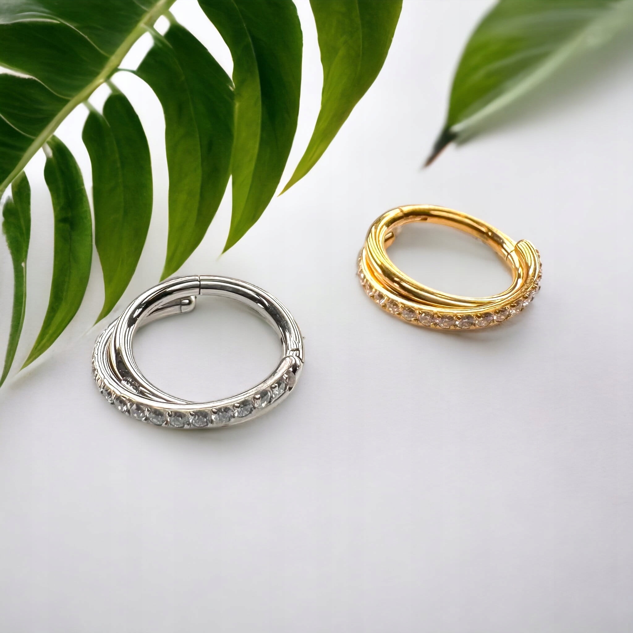Два обруча, замысловато обернутые друг вокруг друга, создают красивый и уникальный узор. В верхней части одного из обручей расположены сверкающие кристаллы, которые освещают серьгу своим сиянием, придавая ей неповторимую изысканность. Второй ободок остается гладким, что придает ему утонченность и гармонию.