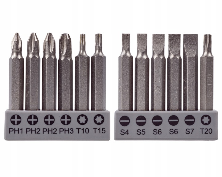- биты 50 мм 12 штук: Philips: PH1, PH2x2, PH3, плоские : S4, S5, S6x2, S7, Torx: Т-10, Т-15, Т-20