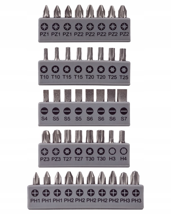 - биты 25 мм 42 штук: Philips: PH1x3, PH2x5, PH3x2, плоские: S4, S5x3, S6x3, S7, Pozidriv: PZ1x3, PZ2x5, PZ3x2, Torx: T-10x2, T15x2, T20x2, T25x2, T-27, T30x2