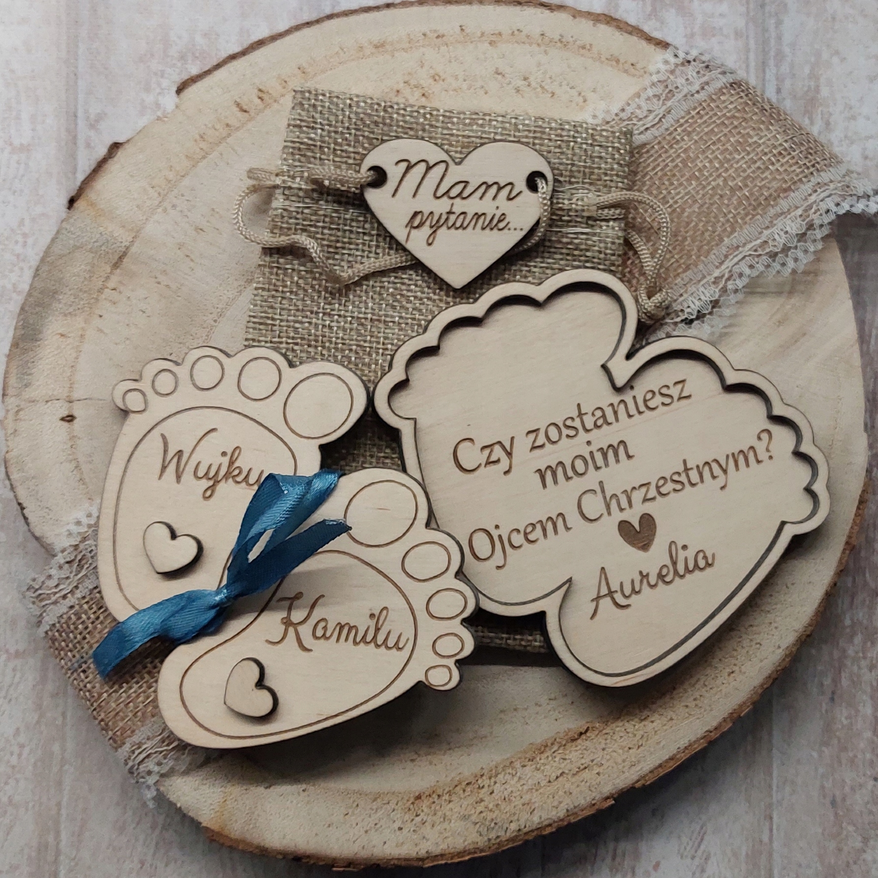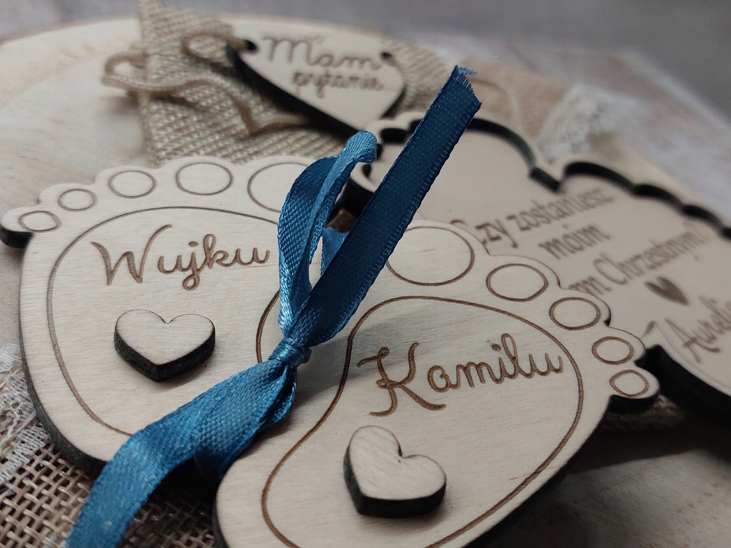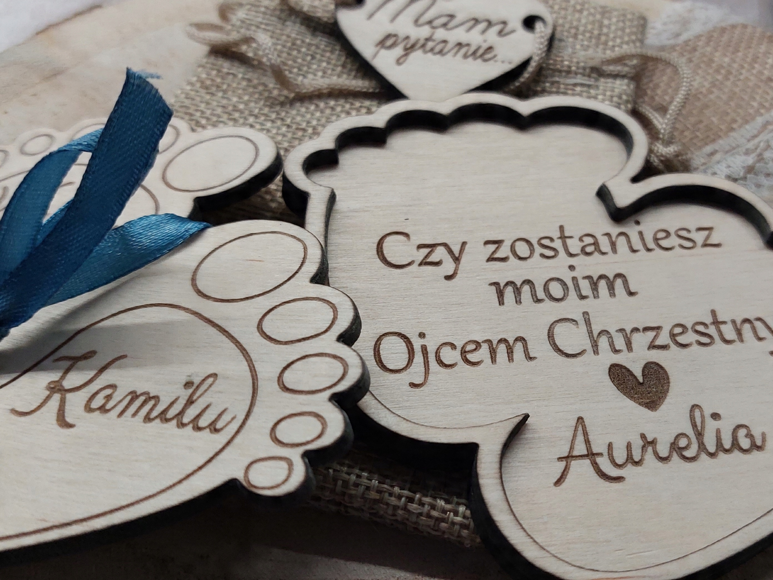 - Пригласительная деревянная (размер стопы примерно 10 х 10 см) «С именной надписью ( укажите имена крестных родителей), например: «Тетя Каролинка», «Дядя Марцин» и т. д.
