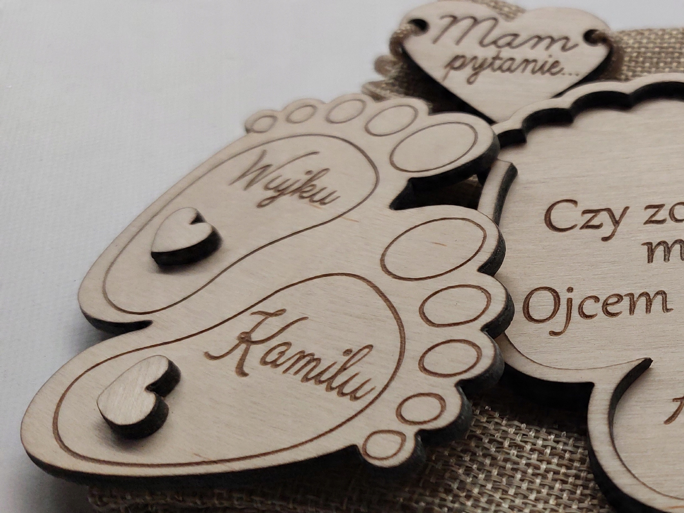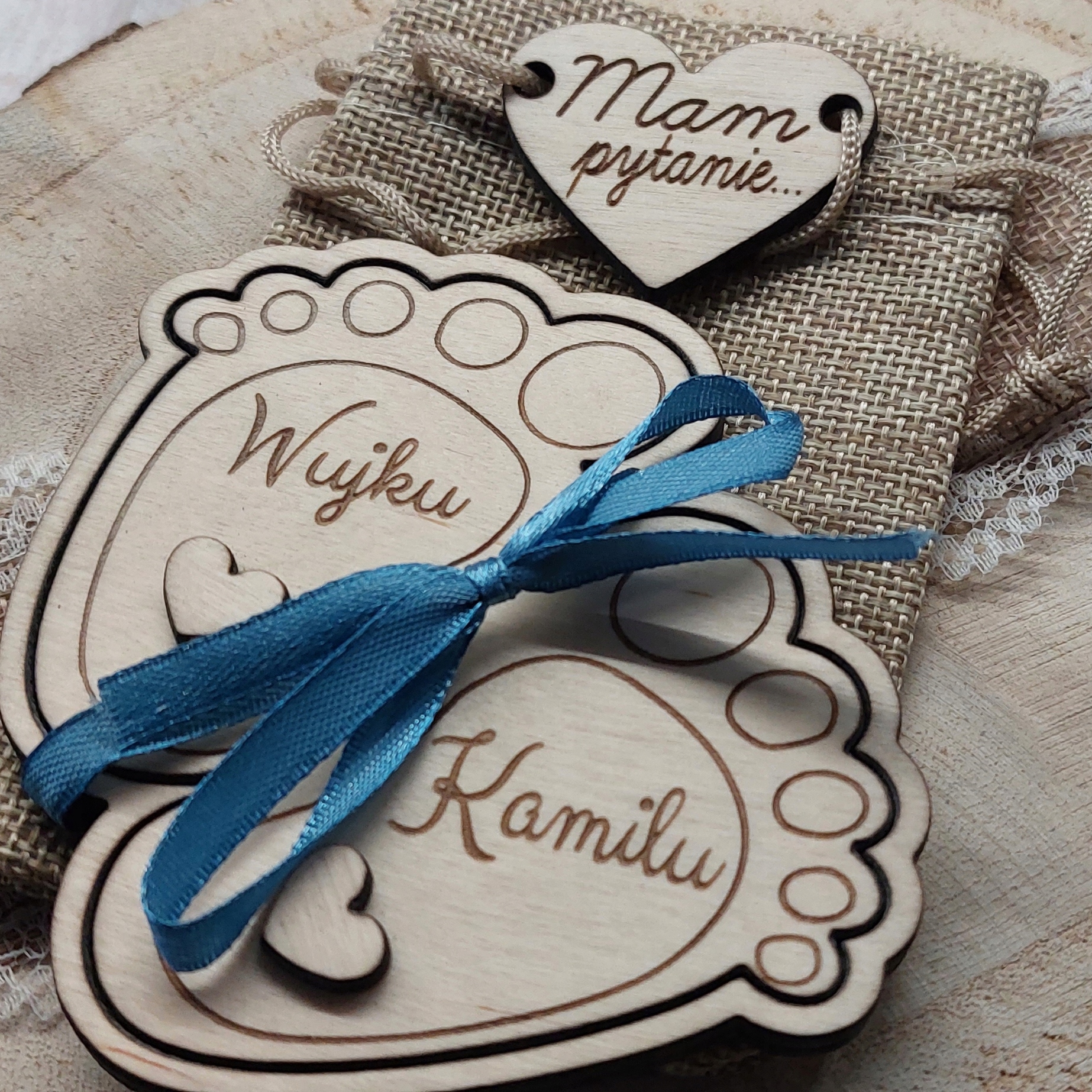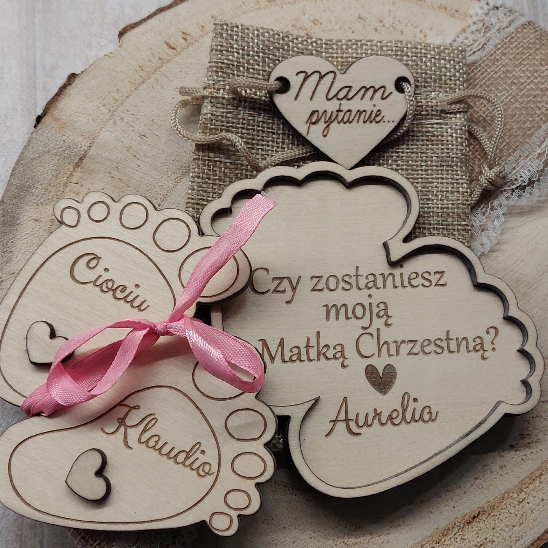 - Пригласительная деревянная (размер стопы примерно 10 х 10 см) «С именной надписью ( укажите имена крестных родителей), например: «Тетя Каролинка», «Дядя Марцин» и т. д.