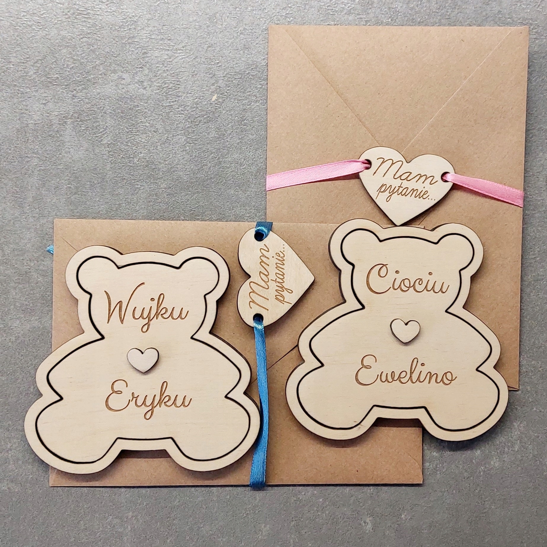 - Пригласительный билет деревянный (мишка, размеры примерно 10 х 10 см) «С именной надписью (укажите имена крестных родителей), например: «Тётя Каролинка», «Дядя Марцин» и т. д.