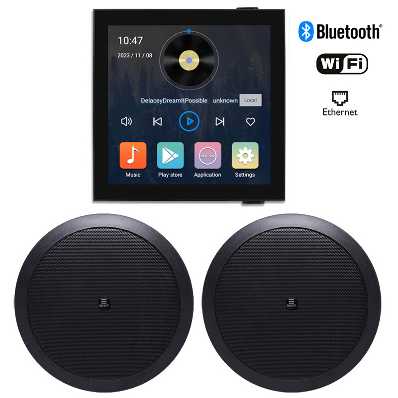 Многофункциональное интернет-радио с Wi-Fi/Bluetooth, 2-зонное, скрытого монтажа, черное, с цветным сенсорным IPS-дисплеем 4 дюйма и двумя круглыми потолочными динамиками черного цвета 6,5 дюйма, 2x 40 Вт bAMP -система от производителя Тяньлай