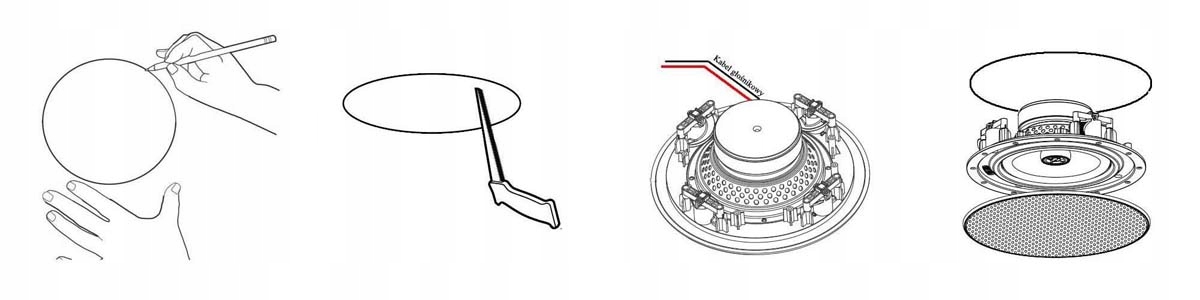 Чтобы установить потолочные динамики, просверлите два отверстия диаметром 186 мм и подключите оба динамика с помощью прилагаемого кабеля динамика к усилителю/настенной панели.