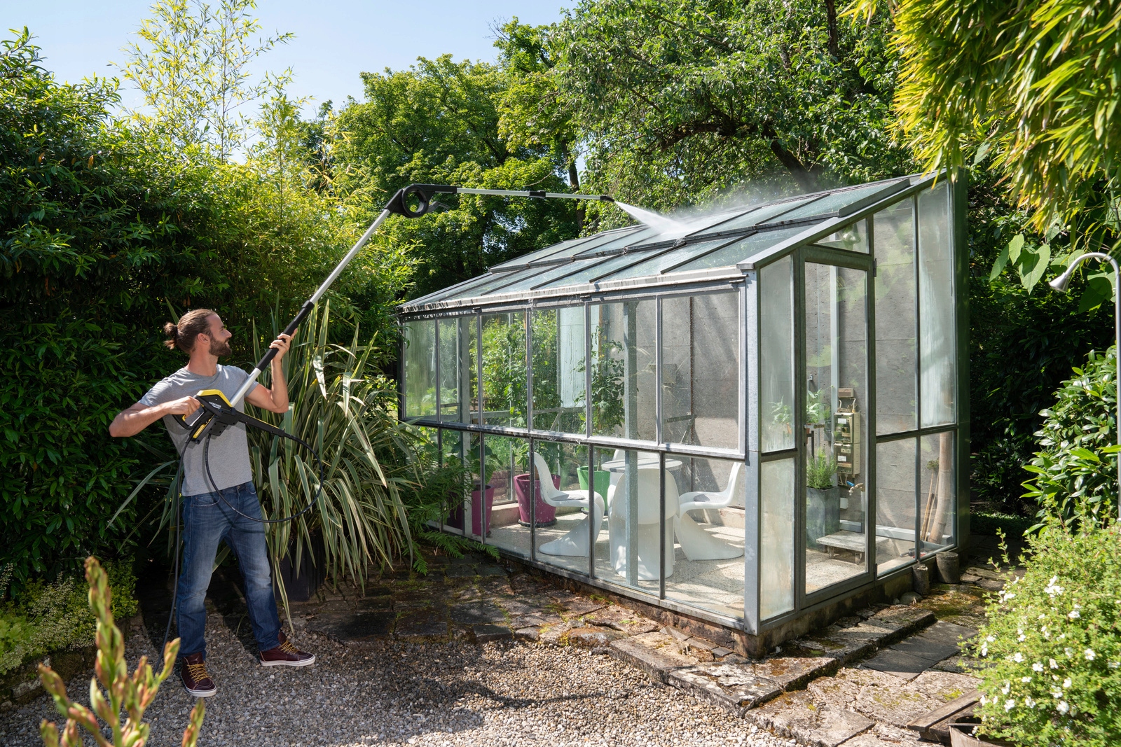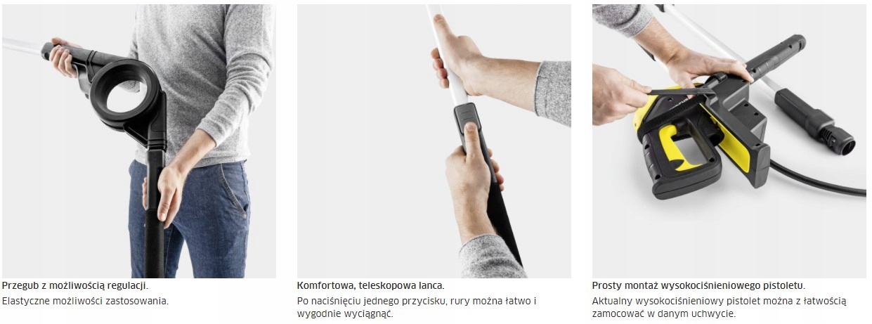 Телескопическая струйная трубка означает, что даже труднодоступные места, например, фасады, можно очистить быстро и без малейших усилий. Штурвал с возможностью регулировки в диапазоне 180 градусов — еще одно преимущество, позволяющее убирать зимние сады, скатные крыши и навесы для автомобилей.