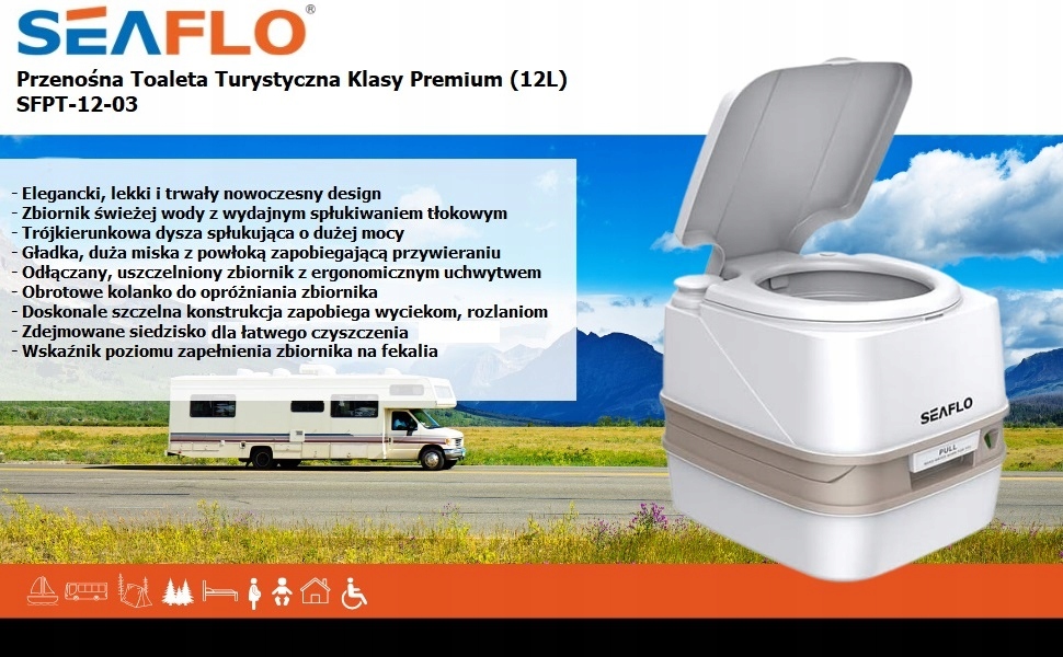 - Прочная и стабильная конструкция:Переносной унитаз Seaflo емкостью 12 литров из полиэтилена высокой плотности со взрослым сиденьем , крышка прочная, конструкция с толстыми стенками, выдерживает вес до 200 кг.