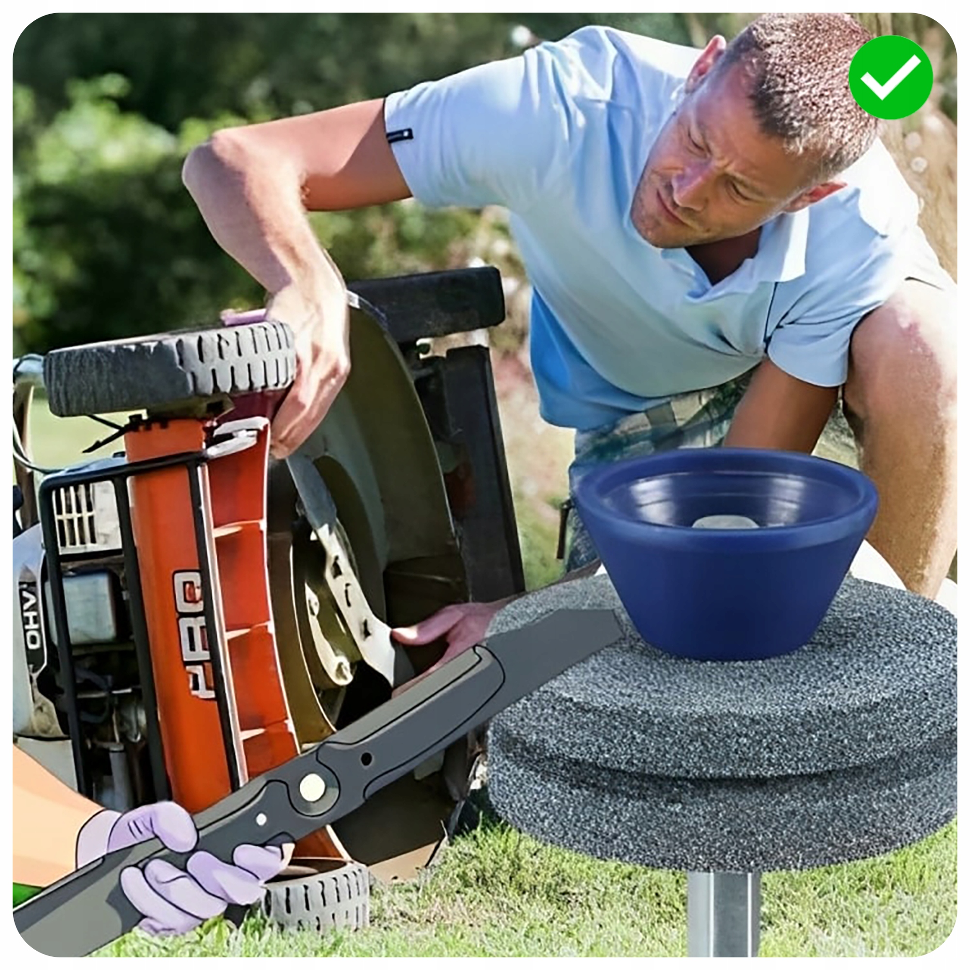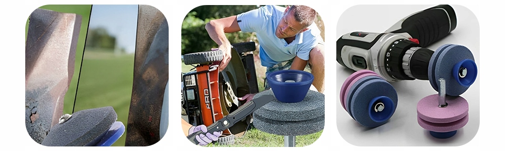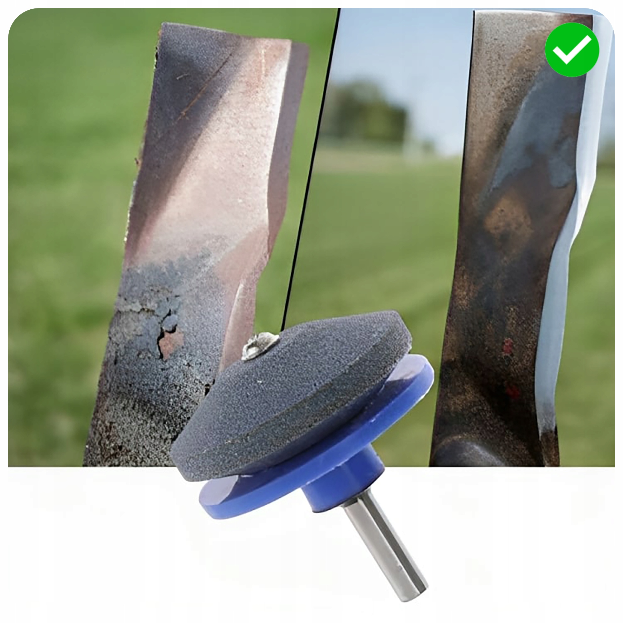 ✅ Точилка удобно работает с большинством ножей газонокосилок без необходимости их разборки, что делает ее удобным инструментом для быстрой заточки.