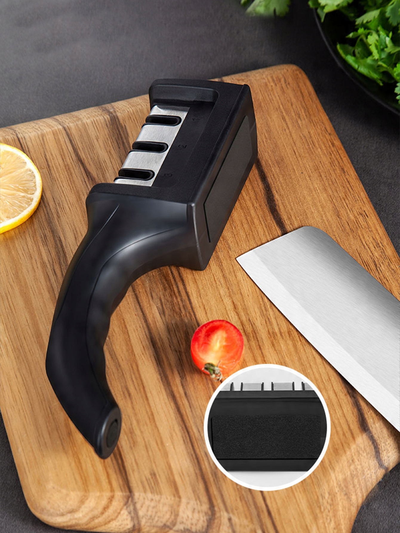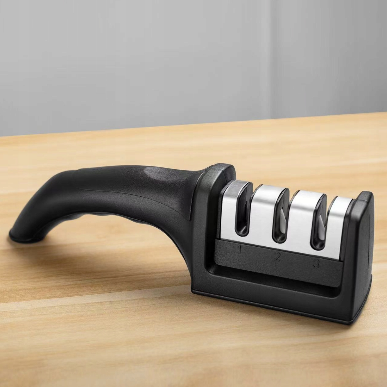 Ручная точилка для ножей имеет 3 слота с различными функциями заточки. Каждый из этапов заточки одинаково важен, поэтому их нельзя пропускать.