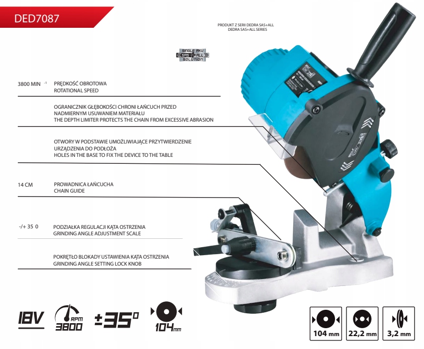 Технические данные точилки для цепей бензопилы 18 В, DEDRA SAS+ALL DED7087: