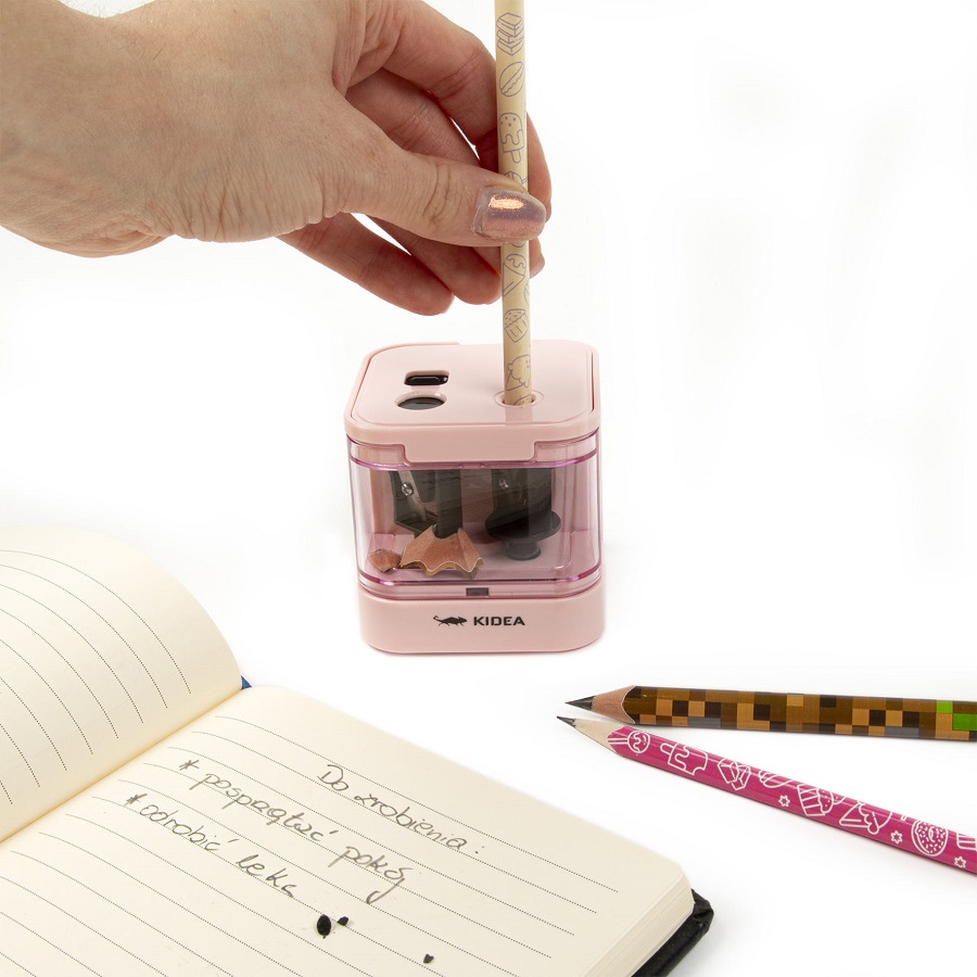 - Электрическая точилка заточит карандаши и мелки двух толщин за несколько секунд.