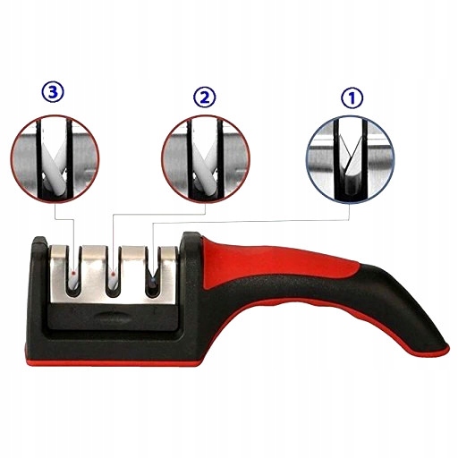 Ручная точилка для ножей имеет 3 головки с различными функциями заточки. Каждый из этапов заточки одинаково важен, поэтому их нельзя пропускать.