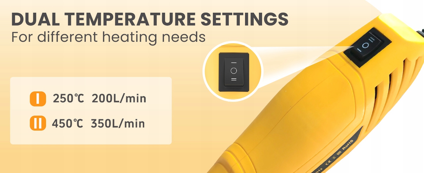 [2 температурных режима и мощность 450 Вт] Эта компактная небольшая тепловая пушка оснащена двигателем мощностью 450 Вт, который нагревается всего за 1,5 секунды. Он имеет два температурных режима: Low I (250°C, 200 л/мин) для более деликатных работ и работ со смолой и High II (450°C, 350 л/мин) для более сложных задач.