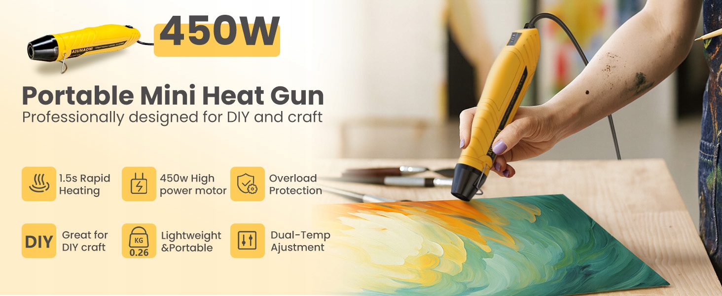[Компактная и портативная небольшая тепловая пушка] Эту легкую миниатюрную тепловую пушку весом всего 260 г очень легко транспортировать. Оснащенный кабелем длиной 1,5 метра, он идеально подходит для свободного перемещения во время рукодельной работы.