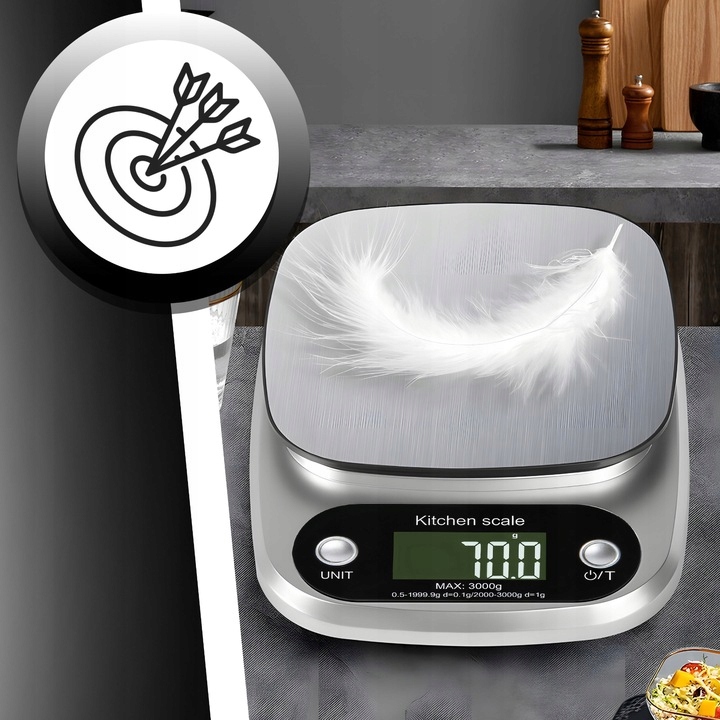 - Точность 0,1 г гарантирует идеальные результаты, что имеет решающее значение при взвешивании специй, небольших добавок или сыпучих продуктов. Современный датчик обеспечивает мгновенные и стабильные измерения, исключая ошибки считывания.
