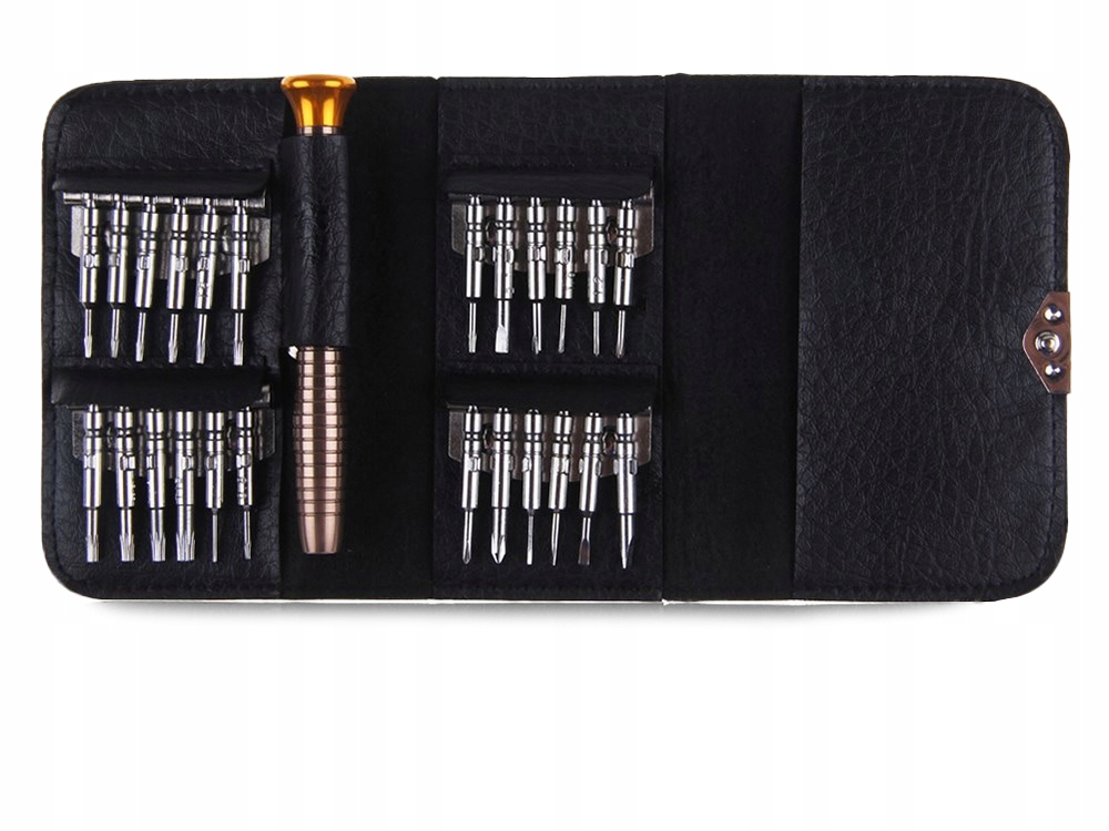 В комплект входят 24 прецизионных насадки и профилированная удобная ручка. Отвертки упакованы в элегантный и удобный футляр, похожий на кошелек.