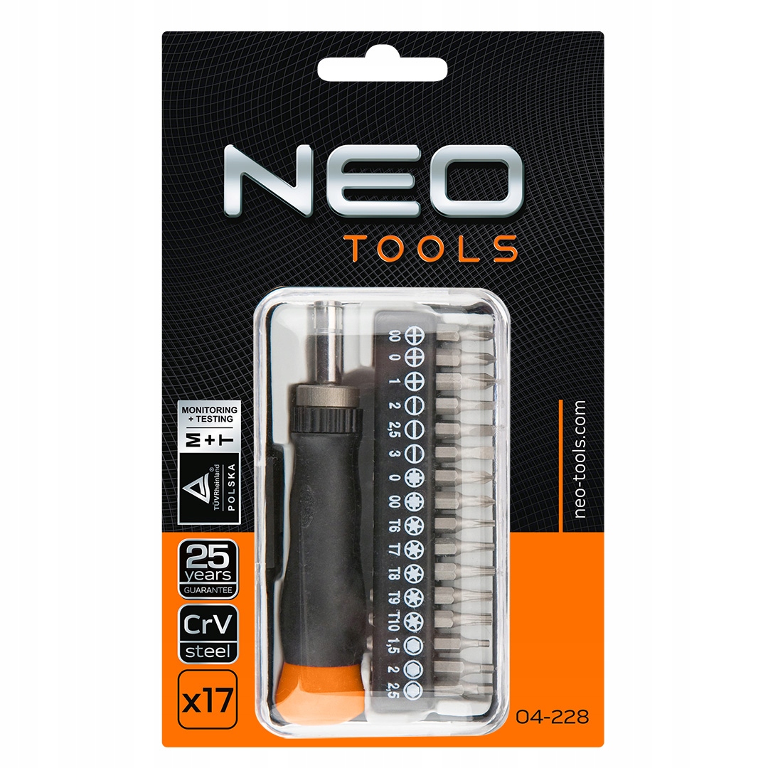 Neo Precision Outcdrivers (ссылка 04-228) содержит ручку и 16 отверток 30 мм (плоский, крест, Torx и шестиугольный). Магнитные наконечники изготовлены из чрезвычайно прочной хромированной стали. Вращающаяся крышка в ручке позволяет точно затянуть винт. Двухворотчатая ручка устойчива к химическим веществам, маслам и смазкам. В целом упаковано в практическом случае. Высокое качество и надежность продукта -сертификат Tüv Rheinland. Бренд NEO соответствует ожиданиям профессионалов.