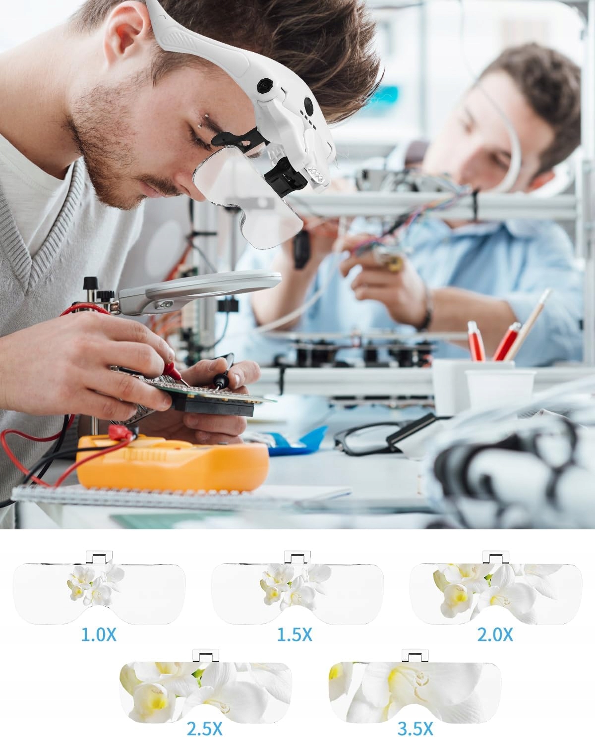 Эти перезаряжаемые лупы, крепящиеся на голову, оснащены 5 линзами с увеличением 1,0x, 1,5x, 2,0x, 2,5x и 3,5x в соответствии с вашими потребностями. Каждая линза надежно хранится в футляре.
