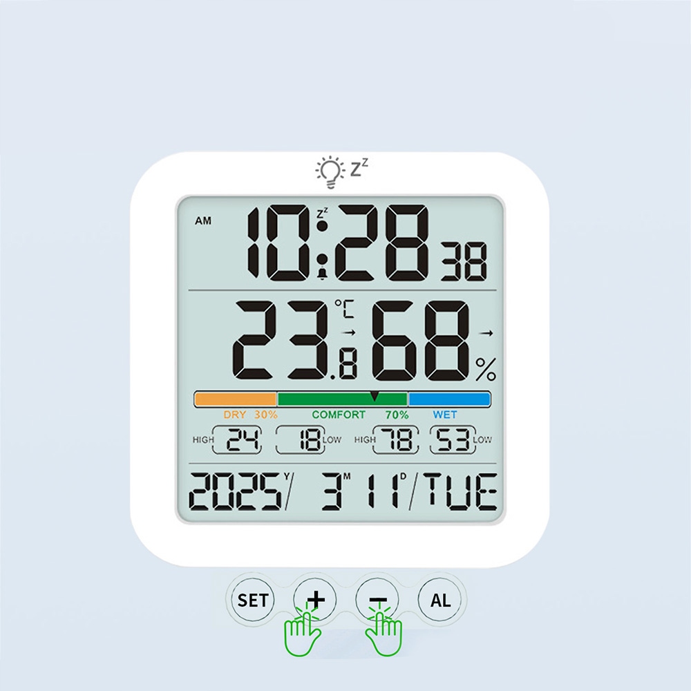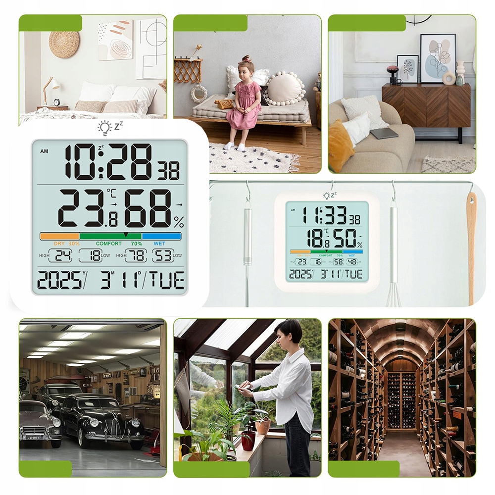 ➡️【Четкий ЖК-дисплей и подсветка для удобства чтения】Измеритель влажности и температуры имеет ЖК-дисплей размером 8,2 см с чистой и элегантной рамкой, что позволяет легко считывать показания под любым углом и с любого расстояния, даже в темноте (автоматическое отключение через 15 секунд). Он портативный и легкий, поэтому его легко носить с собой. Отображение времени поддерживает 12- и 24-часовой форматы; термометр отображает температуру в градусах Фаренгейта или Цельсия.