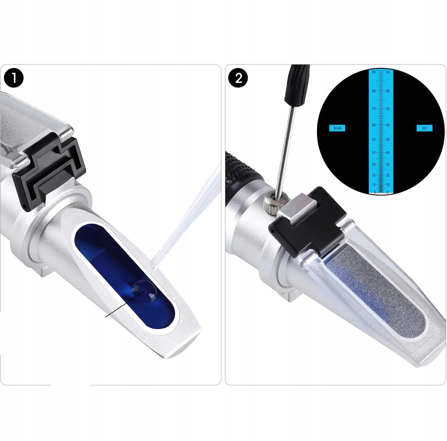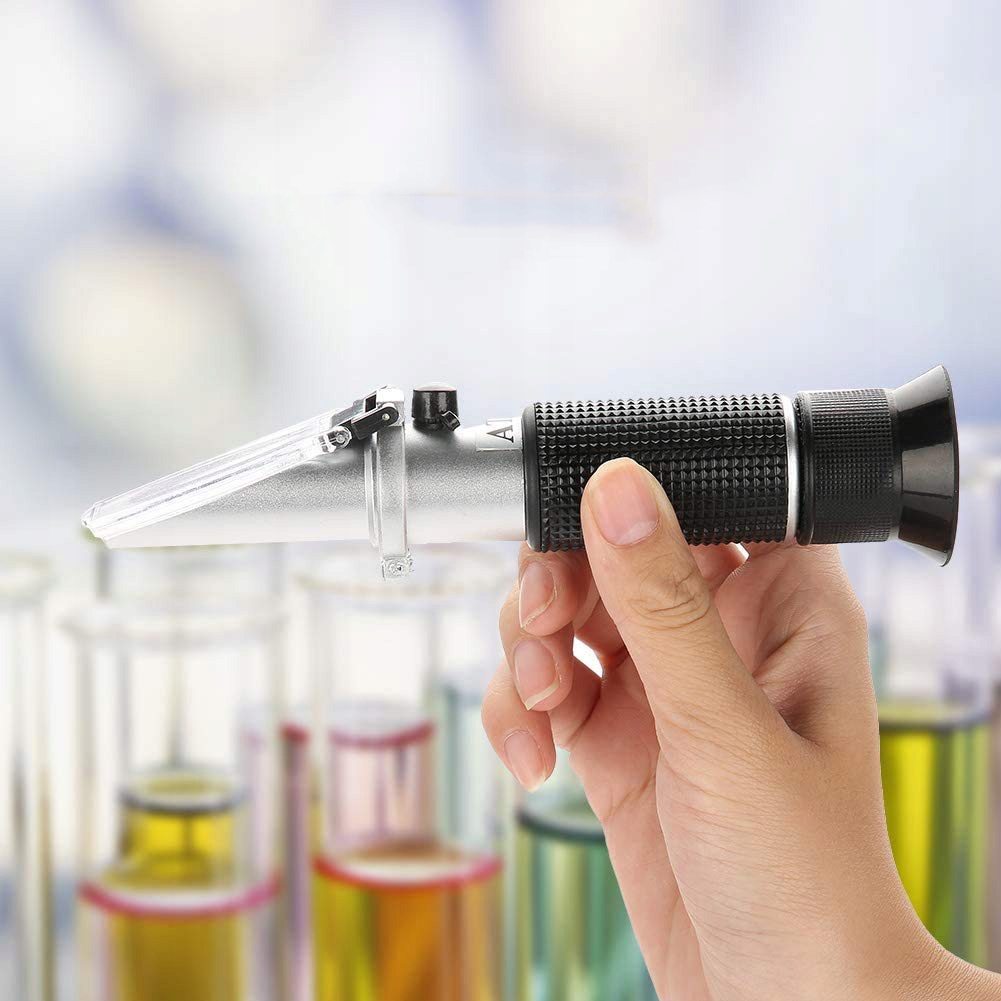 🔵🔵 Простота в эксплуатации: капните две капли воды на призму, поверните винт регулировки нуля до отметки 0 и вытрите насухо. . Добавьте 2–3 капли образца. Выровняйте свет, отрегулируйте кольцо фокусировки, чтобы получить четкие линии шкалы, и подождите 30 секунд для получения точных показаний.