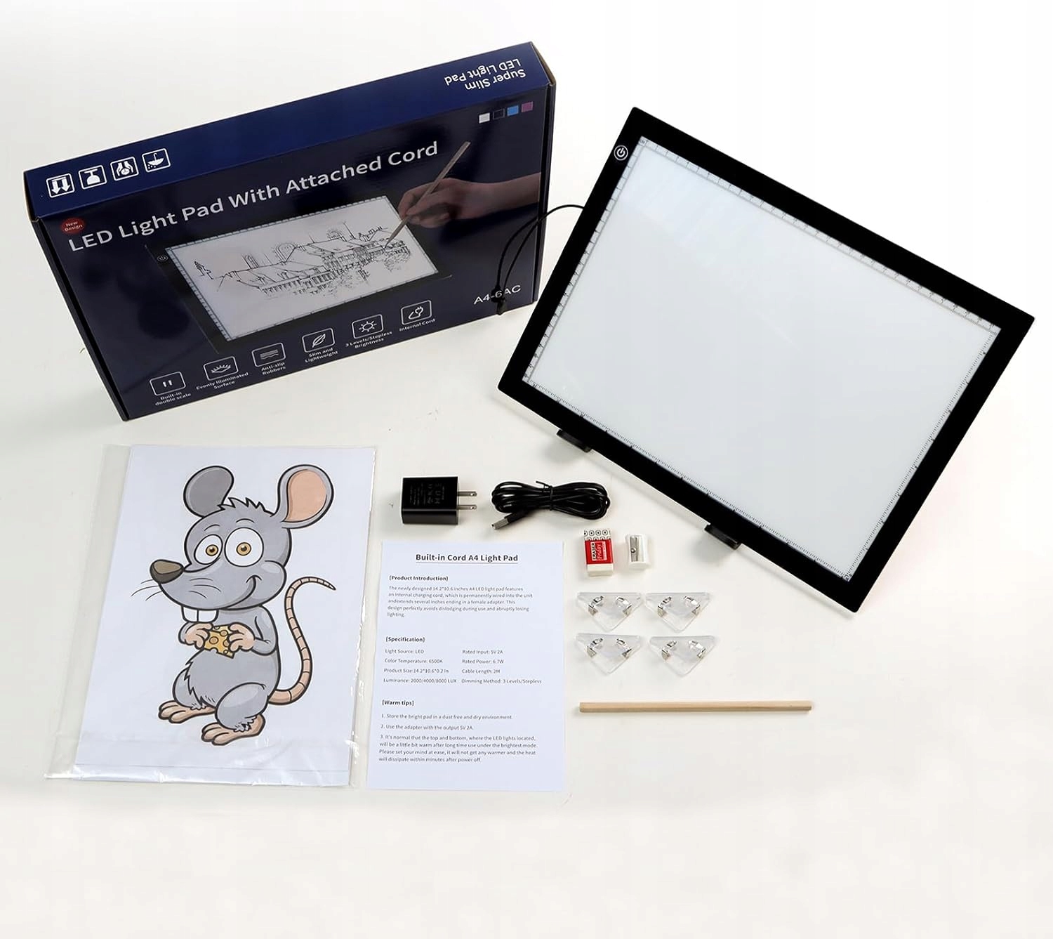 • 【 В комплекте 】 1 сверхяркий световой стол формата A3, 1 подставка для планшета, 1 сертифицированный адаптер UL 5V2A, 4 зажима, 1 кабель Type-C длиной 1,8 м, 1 карандаш, 1 точилка, 1 ластик и 1 руководство пользователя.