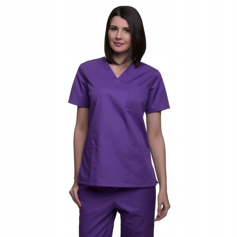V-образный вырез, короткие рукава, два кармана на уровне бедер и карман на левой груди (здесь мы предлагаем разместить логотип компании или персонификацию из флекса - для этого необходимо обратиться к производителю).
