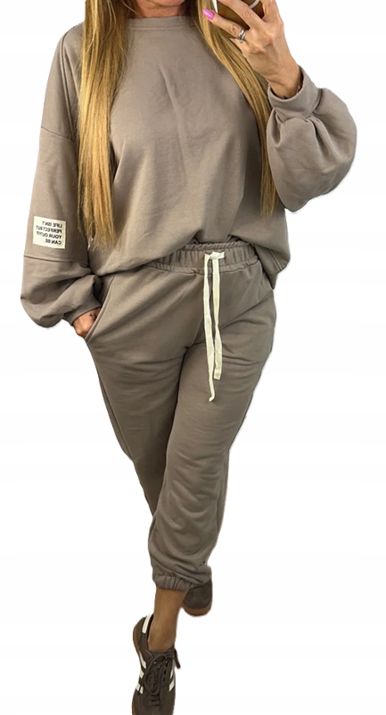 Модный и стильный набор пота с этикеткой на рукаве, созданном из приятного хлопкового трикотажа, является идеальным предложением для всех женщин, которые хотят чувствовать себя комфортно в спортивном костюме, теплый и в то же время выглядеть стильно. Толстовка негабаритного изделия отличается минималистской этикеткой, сшитой на рукаве. Ее длинные рукава и дно были закончены манжетами. Брюки - это модель с классическим вырезом с welt на ногах, а также гибкая эластичная лента на талии, благодаря которой они идеально адаптируются к фигуре.