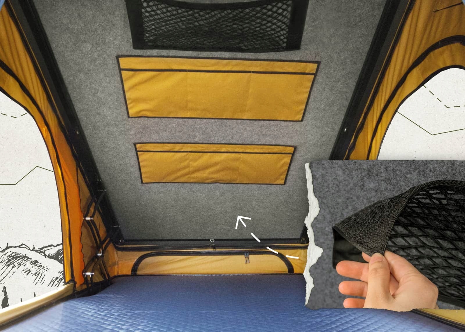 Входитдве багажные сетки и два больших кармана. С одной стороны, у них есть липучки, поэтому вы можете менять их расположение по своему желанию. Мы также включили постоянное светодиодное освещение с регулируемой интенсивностью света. Просто подключите источник питания 5 В через разъем USB. Дополнительные два кармана меньшего размера для аксессуаров можно найти на внутренних стенках палатки.