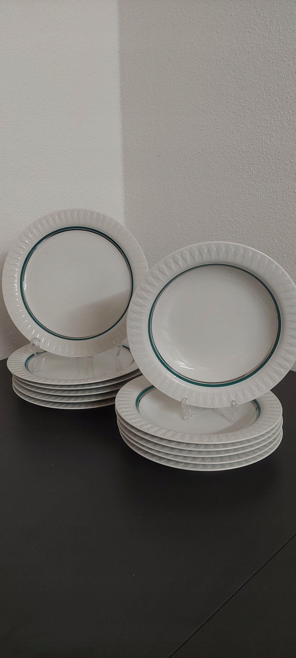 шесть мелких пластин диаметром 24 см, шесть глубоких пластин диаметром 22 см. Очень хорошее состояние