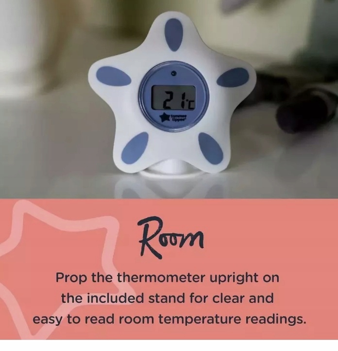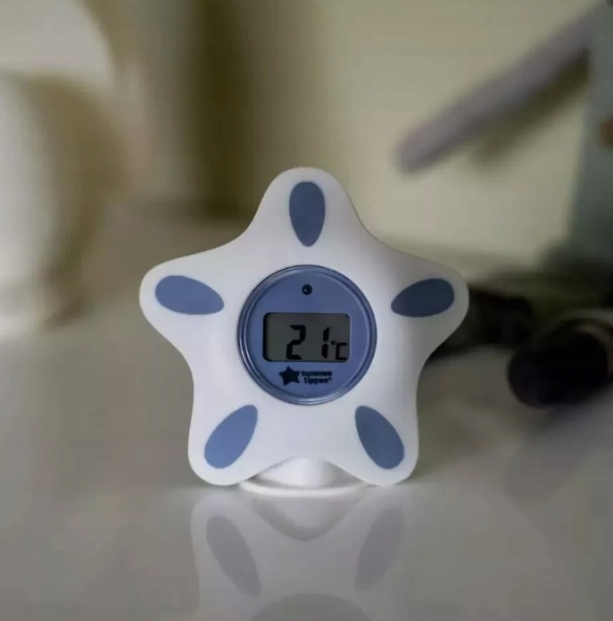 Этот цифровой термометр с уникальным дизайном в форме знаменитой звезды Томми Типпи впишется в любой интерьер детской или ванной комнаты. Термометр двойного назначения — это быстрый, простой и точный способ измерить температуру воды в детской комнате или в ванне, поэтому вам больше не придется гадать, не слишком ли она горячая. Коснитесь устройства, чтобы включить дисплей, и подождите 5 секунд, пока на четком ЖК-экране не отобразится температура в градусах Цельсия. Полностью водонепроницаемый термометр плавает в ванне и записывает показания температуры каждые 5 секунд, поэтому вы можете быть уверены, что температура воды составляет от 36,5°C до 38°C — оптимальная температура для комфортного и безопасного купания вашего ребенка. Если температура воды превысит 39˚C, на экране загорится красная сигнальная лампа, указывающая на то, что вода слишком горячая. Оптимальная температура в комнате для ребенка – около 18°С. Обеспечение комфортной температуры в комнате или спальной зоне вашего ребенка важно для обеспечения безопасного и комфортного сна. Измеряя температуру в помещении, вы можете предпринять шаги, чтобы правильно обогреть или охладить комнату, или помочь решить, как одеть ребенка для сна. Поместите термометр вертикально на прилагаемую подставку, чтобы быстро измерить температуру в помещении. Оснащен 1 сменной батареей CR2032, поэтому вы можете использовать ее немедленно. Функция автоматического отключения выключит термометр, если задняя часть устройства не соприкасается с водой или подставкой, поэтому вам не придется беспокоиться о потере заряда батареи, если вы забудете его выключить.