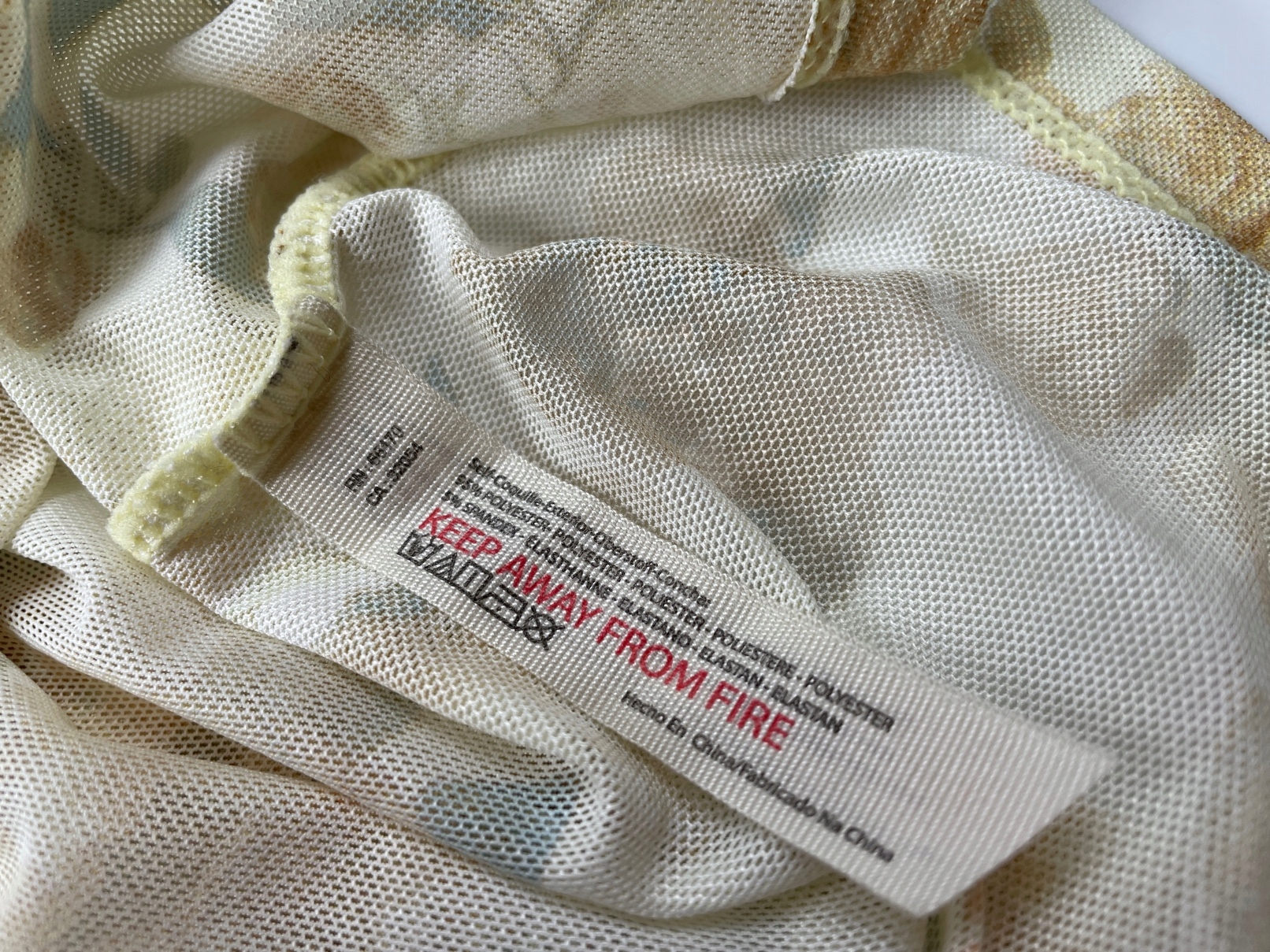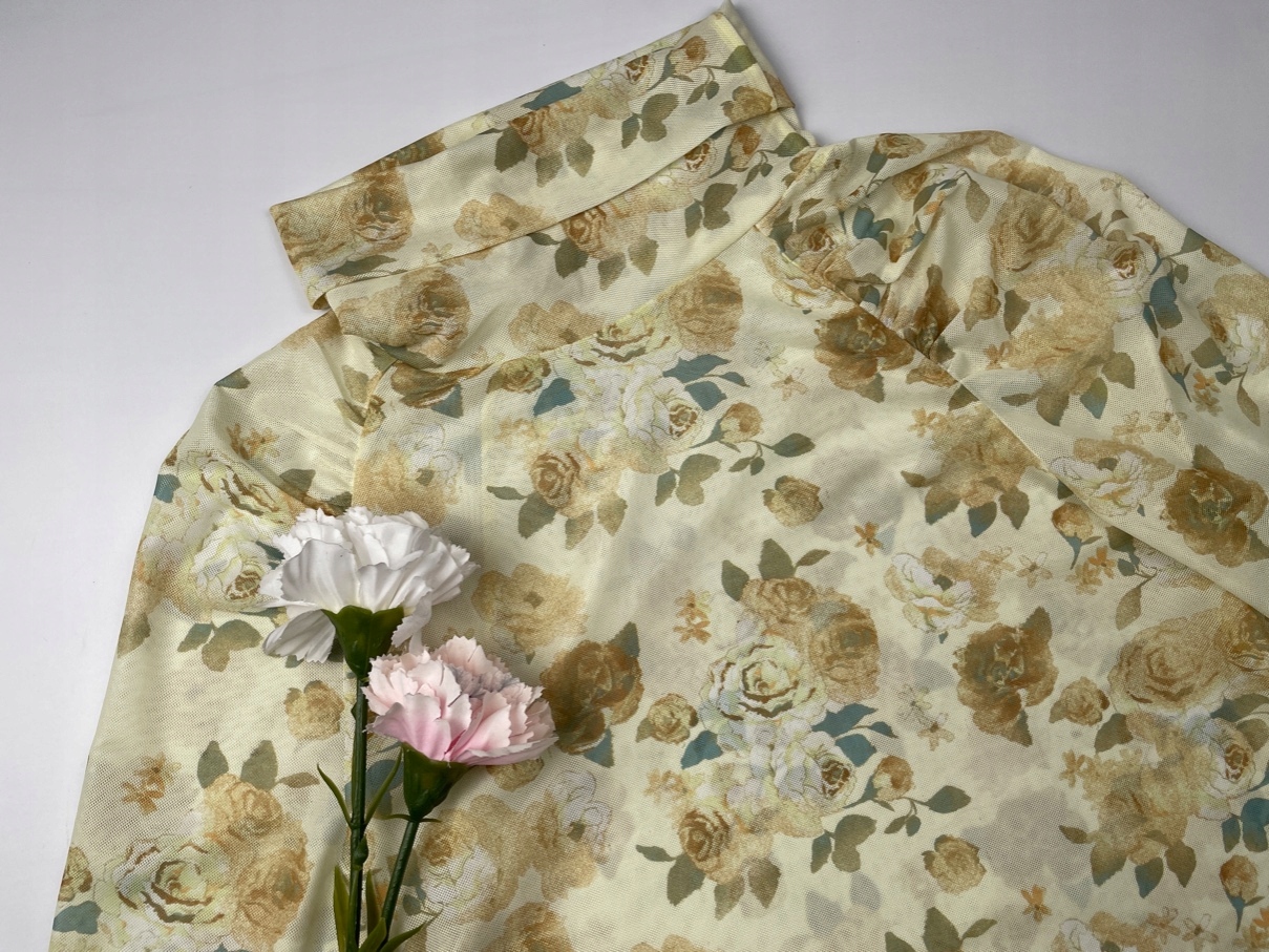 - Женский гольфик от свободных людей. Это желтый, в рисунке реалистичных роз. Он был сделан из тонкого полупрозрачного сетчатого материала. Он очень гибкий, соответствующий- он прекрасно подчеркнет фигуру. У него есть длинные рукава, буксиры и легкая шайба на плечах