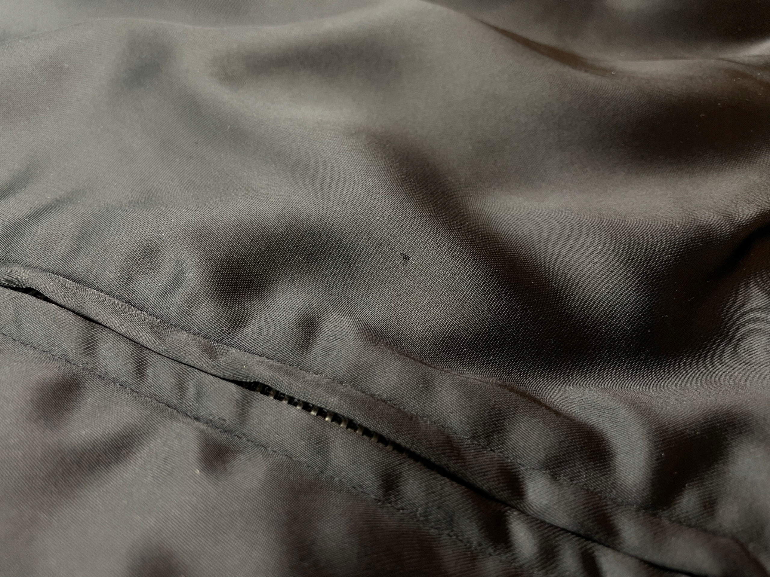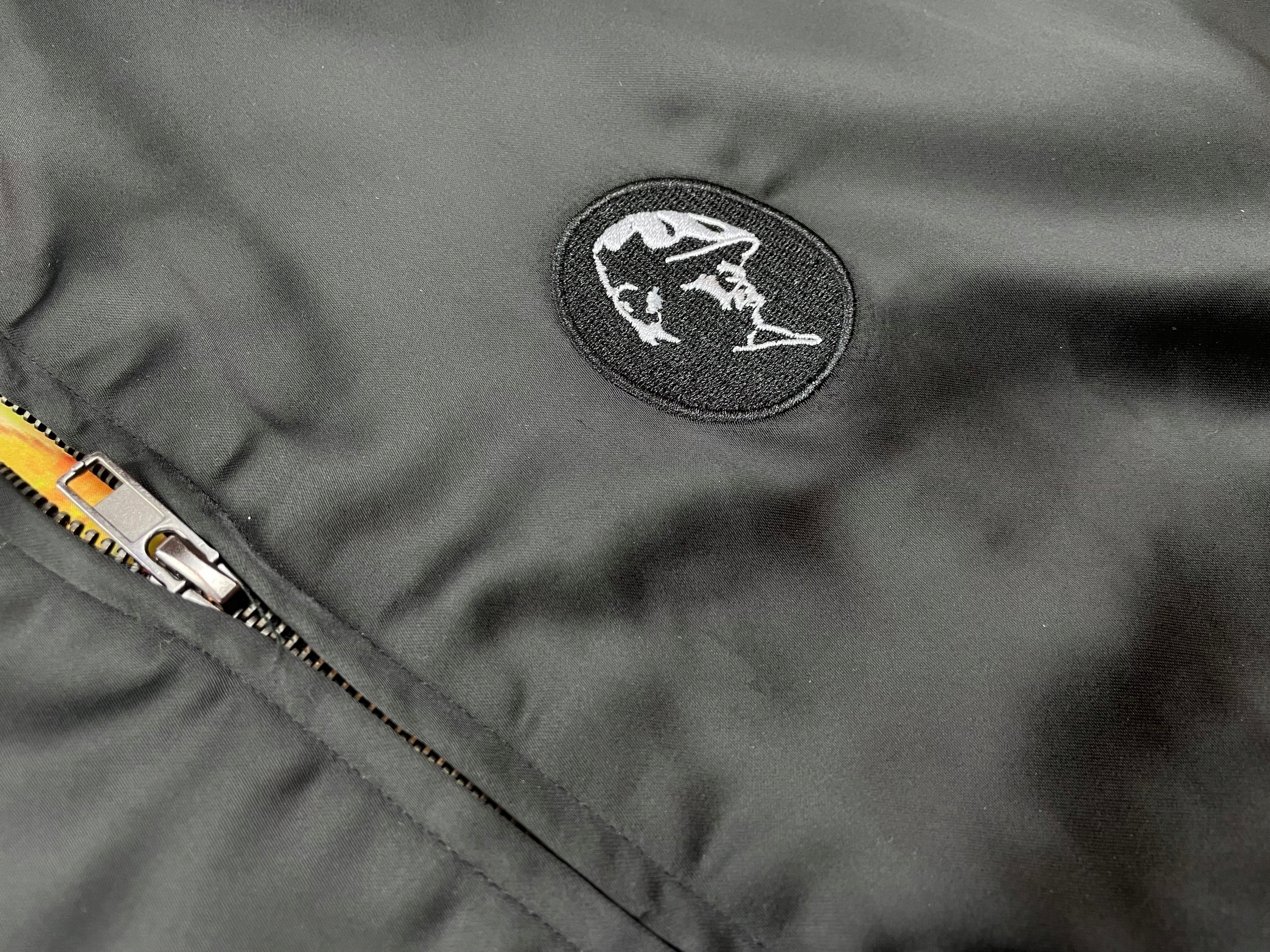 - Тонкий мужской бомбер. Передняя часть гладкая черного цвета, а задняя часть полностью напечатана. Застегивается на молнию. Имеет два классических кармана. Куртка не утеплена.
