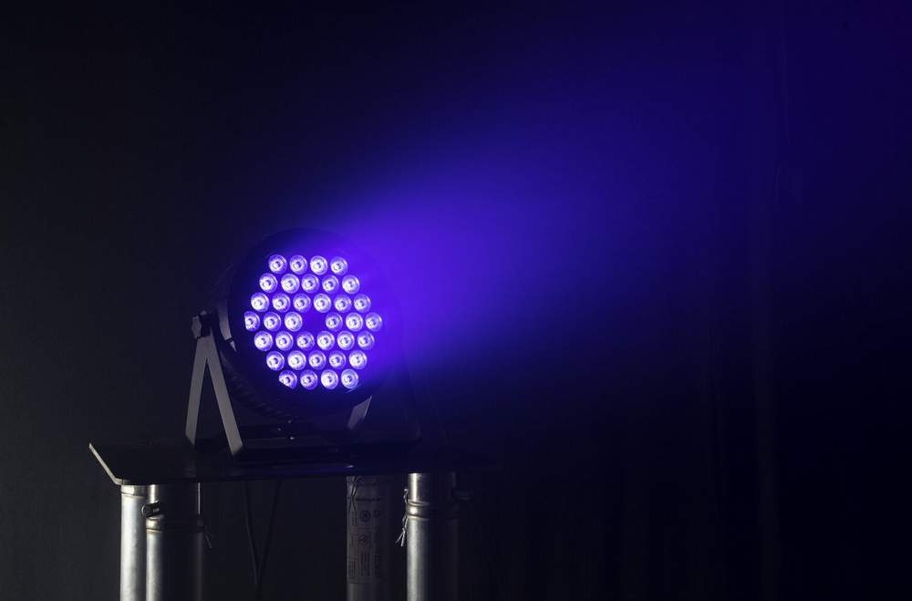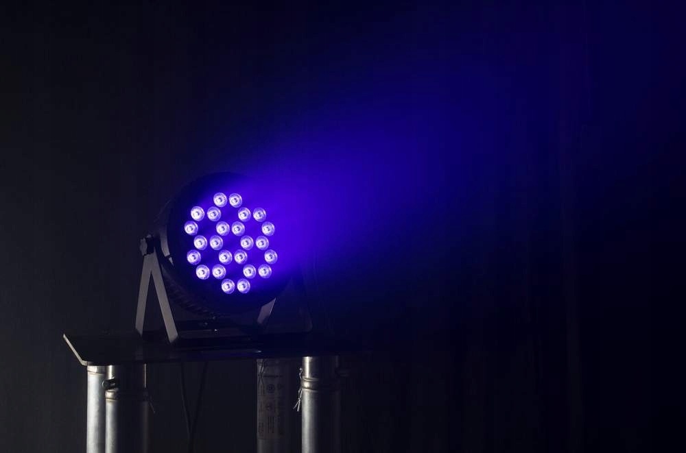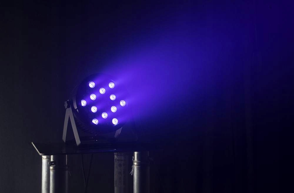 Профессиональный ультрафиолетовый светодиод от DMX512. Он содержит регулируемые кронштейны, обеспечивающие положение света на земле, устанавливаясь на стене или подвеску на рампе. Свет содержит пульт дистанционного управления IR.