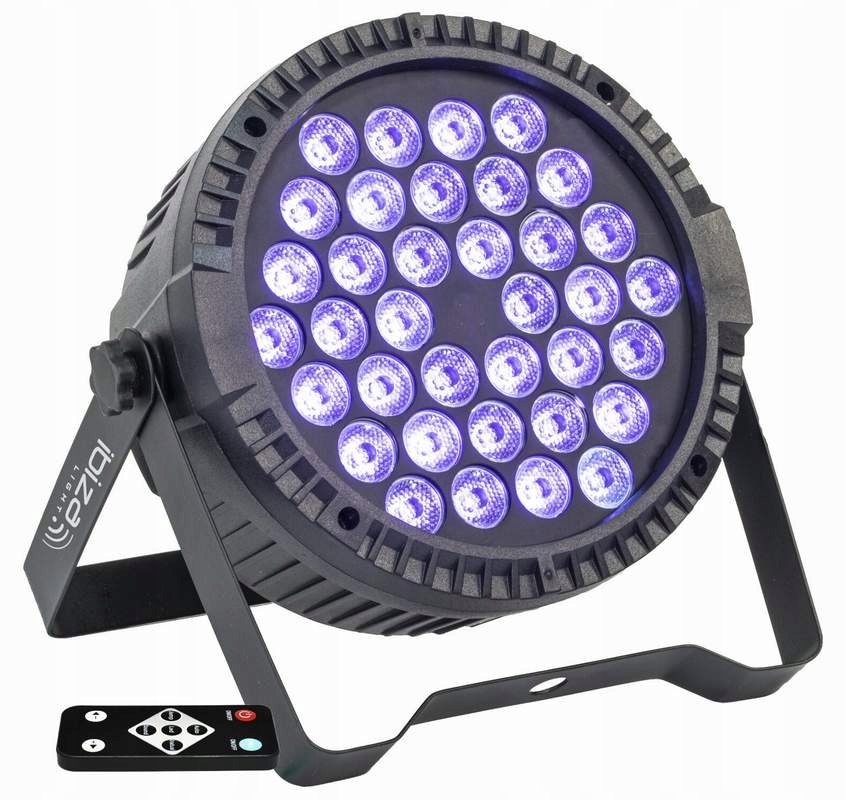 Профессиональный ультрафиолетовый светодиод от DMX512. Он содержит регулируемые кронштейны, обеспечивающие положение света на земле, устанавливаясь на стене или подвеску на рампе. Свет содержит дистанционное управление IR. - 36 УФ-светодиодный свет: 32w- 1/2 dmx.
