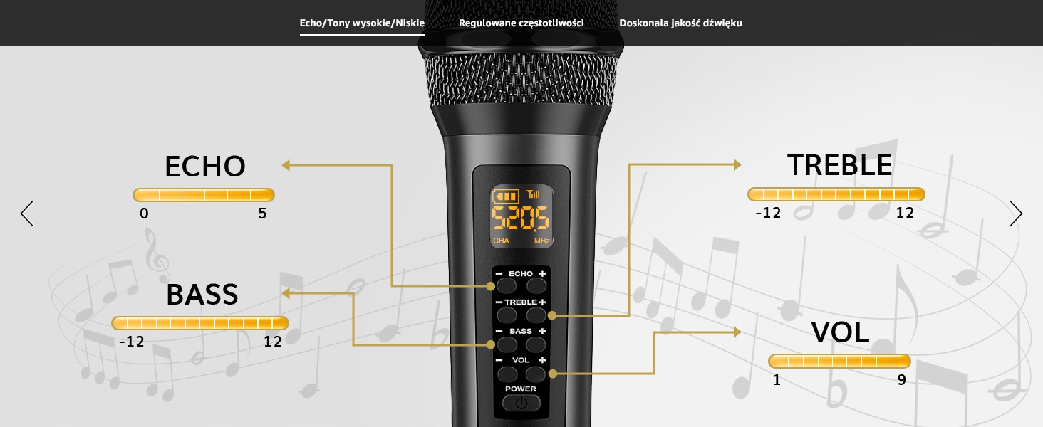 Регулировка высоких/низких частот/эха/громкости: Беспроводные микрофоны, оснащенные кнопками эха, высоких частот, низких частот и громкости, предлагают широкий спектр звуковых эффектов в соответствии с вашими потребностями. Кардиоидный капсюль обеспечивает теплый и плавный звук с исключительными возможностями подавления обратной связи.