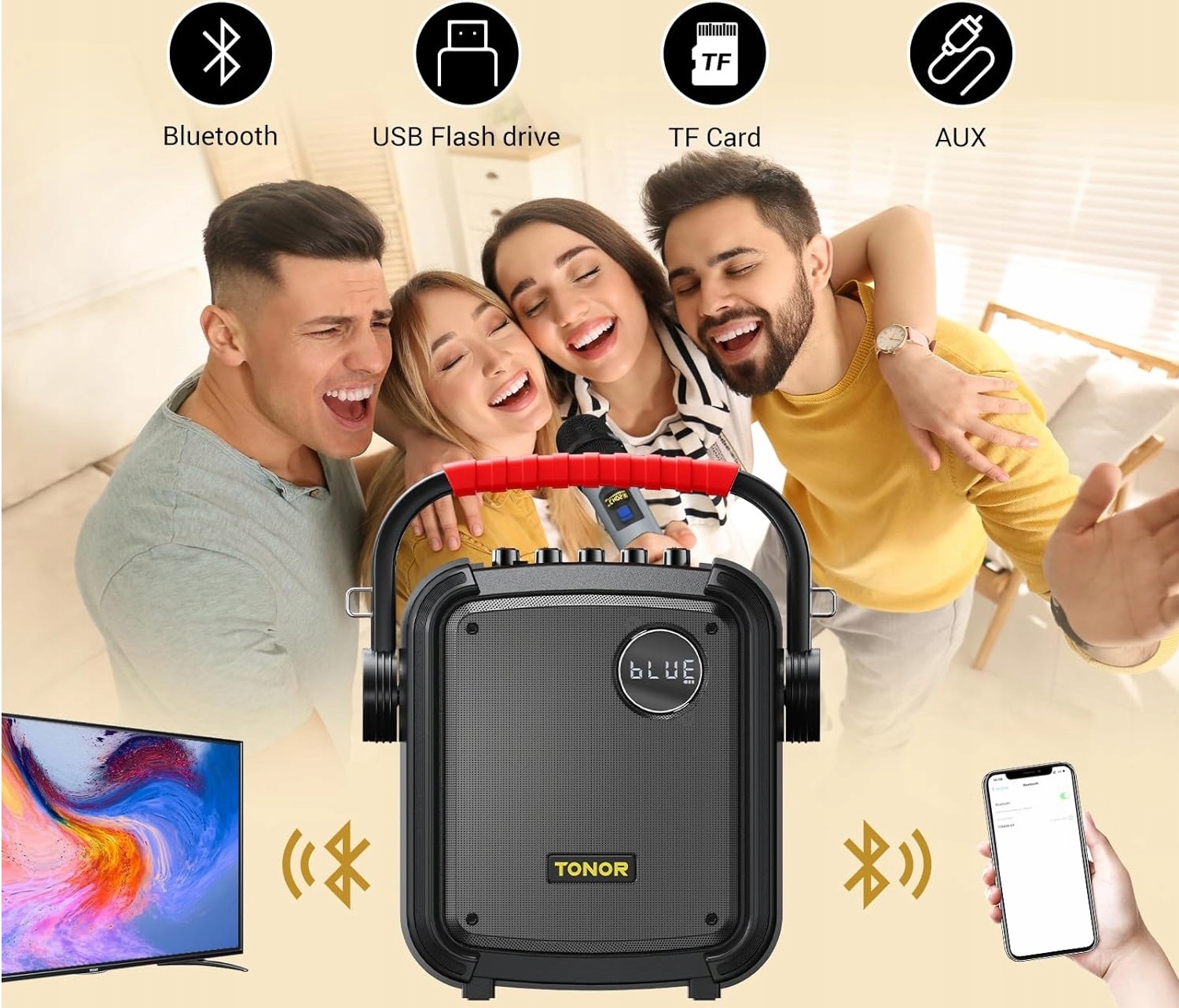 Благодаря Bluetooth 5.0 и двум беспроводным микрофонам комплект Tonor K7 обеспечивает стабильную передачу и свободу петь от души. Он поддерживает TF-карты и USB-накопители и может быть совместим с различными устройствами, такими как iPhone, телефоны Android, iPad, планшеты и ПК, выступая в качестве беспроводного динамика. Функция TWS позволяет подключить две колонки Tonor K7 для создания стереосистемы.