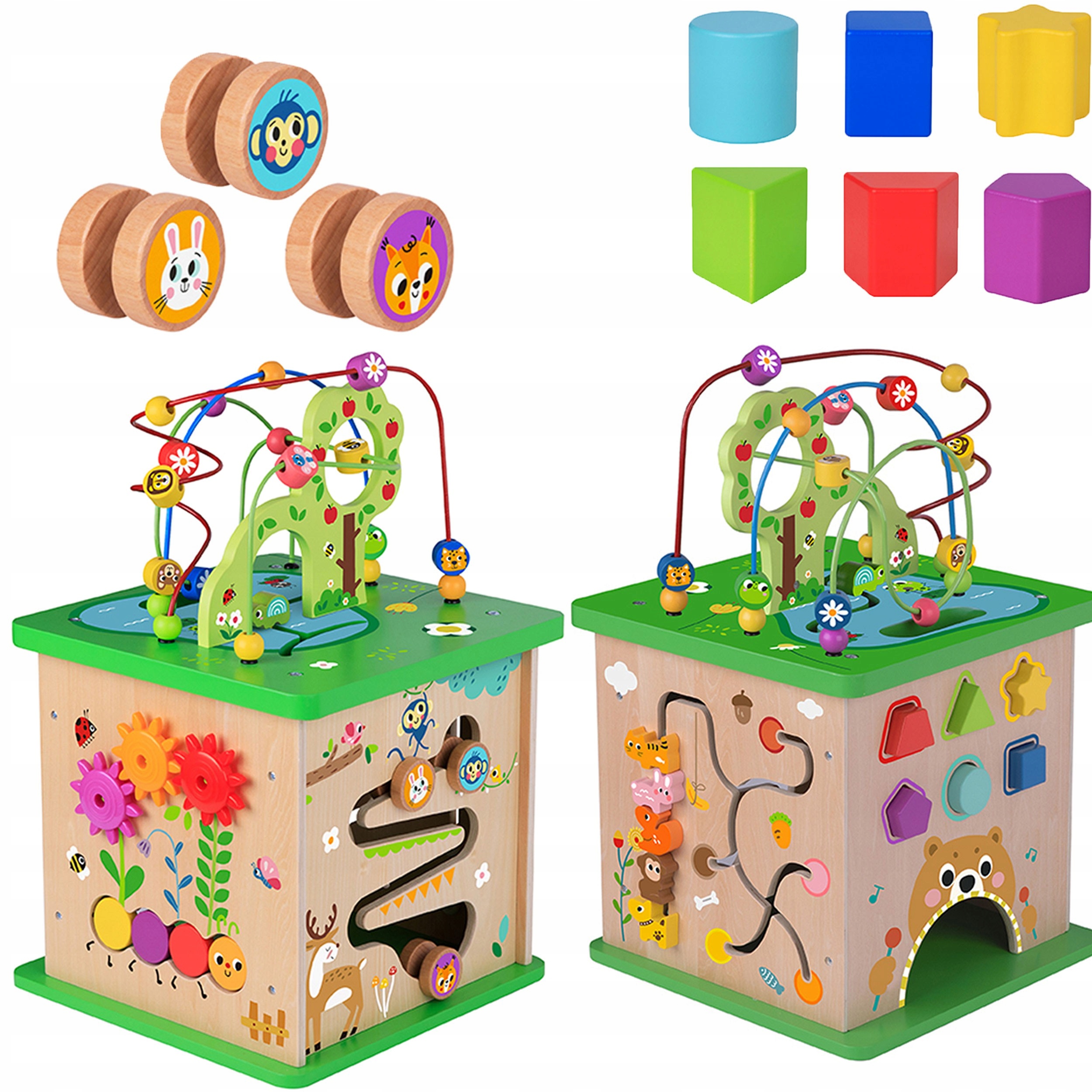 - - игрушка состоит из 5 различных форм активности: моторной петли, сортера, вращающихся блоков с животными в лабиринте, шестеренок и лабиринта с животными и соответствующей дорожки для сопоставления по цветам