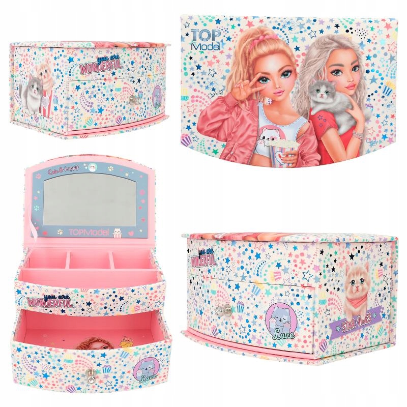Личные сокровища: маленькая шкатулка для драгоценностей TOPModel Cutie Star с очень милой звездой, забавными значками попкорна, очаровательными котятами и стильной моделью с принтом, имеет зеркало на клапане, разделенное основное отделение и большой ящик с пуговица со стразами.