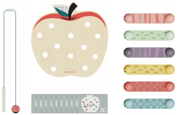 - это комбинация правил: Игры с потоком и воспроизведения дюбелей. Дети или заправляйте червя на струне через отверстия в яблоке или положите красочные черви с дюбелями в отверстия. Игрушка проста в использовании, но в то же время является проблемой для небольшой головы.