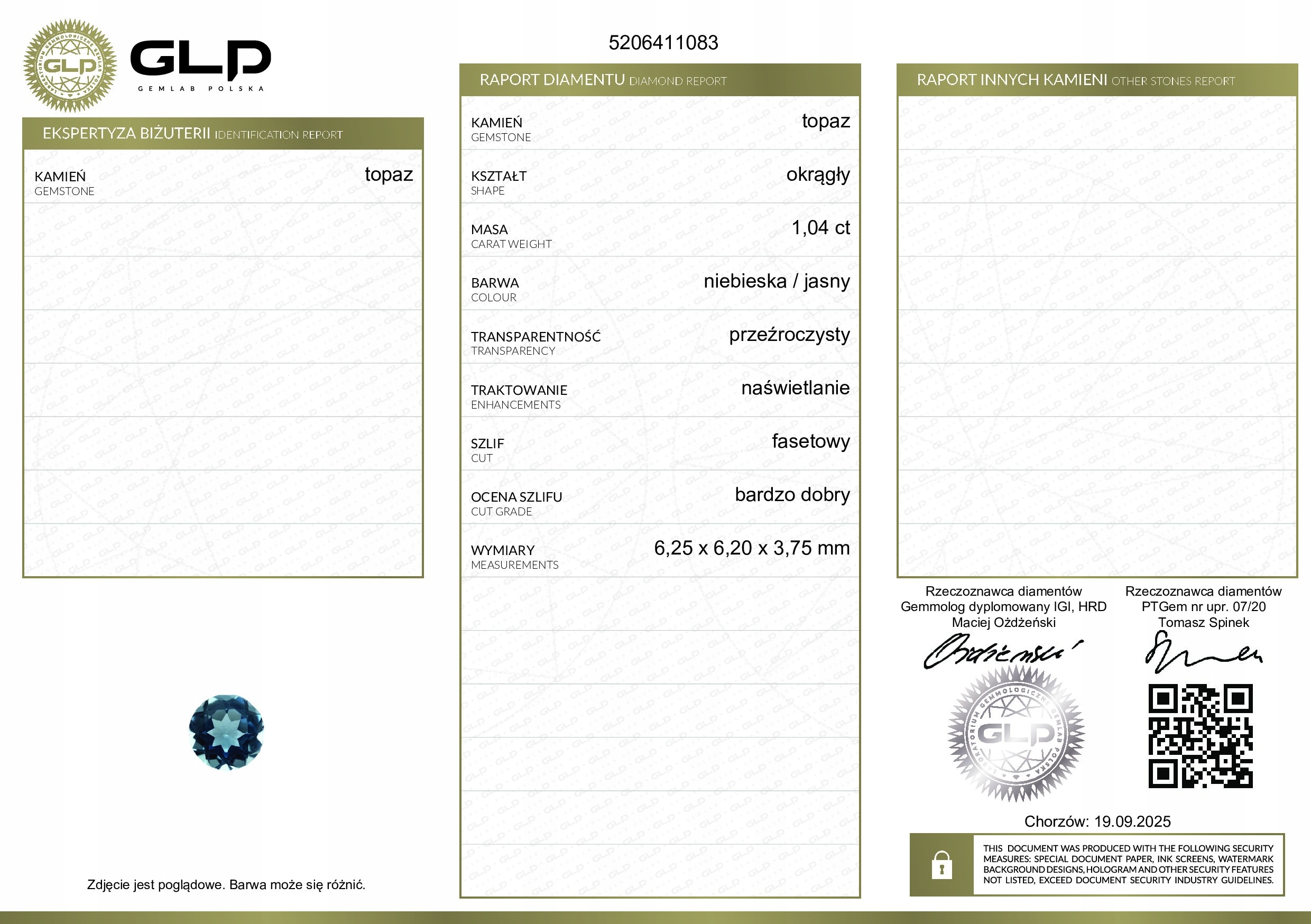Каждый драгоценный камень, предлагаемый Diamanti, доставлен с профессиональным сертификатом авторитетной геммологической лаборатории. В случае этой копии это GLP (Gemlab Polska), который подтверждает его параметры и подлинность.