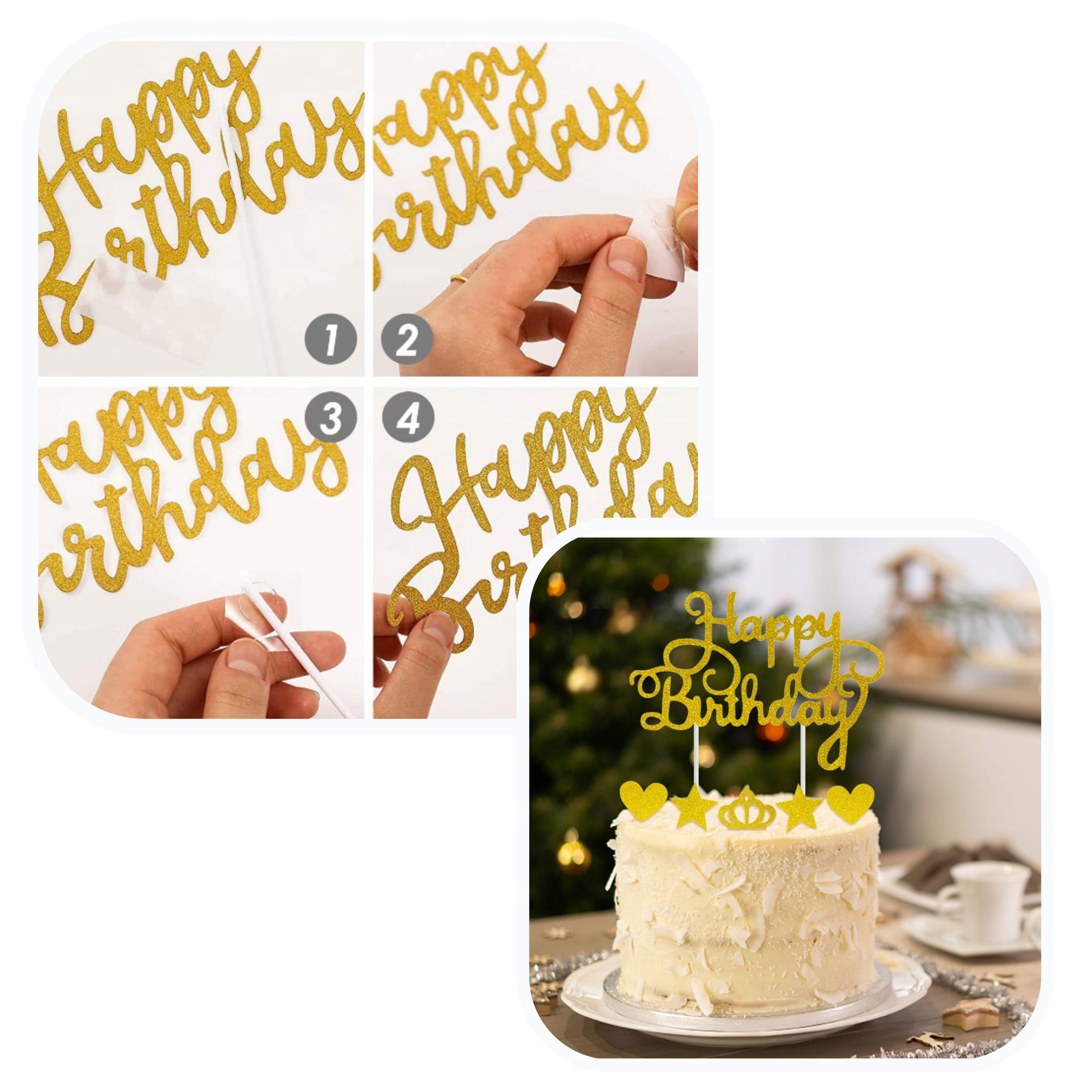 Топпер с надписью «С днем рождения» можно использовать как самостоятельное украшение или комбинировать с другими украшениями, размещенными на торте. Это самый простой способ подготовить элегантную вечеринку. Топпер имеет квадратную форму и высоту несколько сантиметров. Благодаря этому его будет хорошо видно на столе.