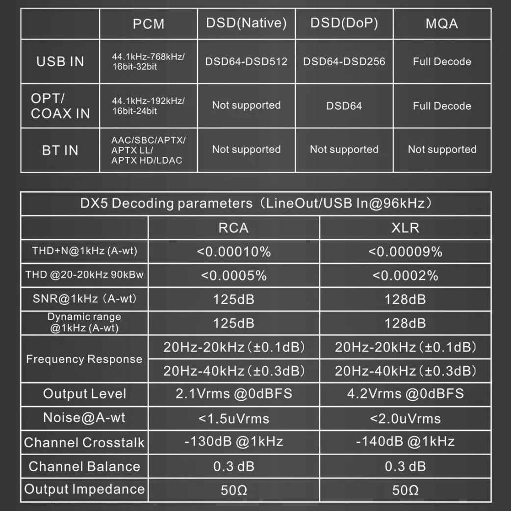 DX5 использует преимущества звука Hi-Res Audio. Сертификация беспроводной связи благодаря интеграции чипа приемника Bluetooth QCC5125, поддерживающего кодеки передачи, способные передавать в высоком разрешении. Это делает его совместимым с протоколами aptX, aptX HD, aptX LL и LDAC, а также со стандартами SBC и AAC. Более того, сигнал, принимаемый чипом Bluetooth, декодируется парой ЦАП ES9068AS, гораздо более мощным, чем ЦАП, встроенный в Bluetooth-приемник.