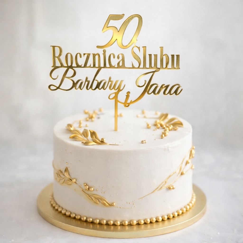 Элегантный персонализированный топпер для юбилейного торта, идеально подходящий для юбилеев свадьбы - от первых годовщин до особого Золотого юбилея. Оформление придает торту торжественный характер и является прекрасным дополнением семейного торжества.