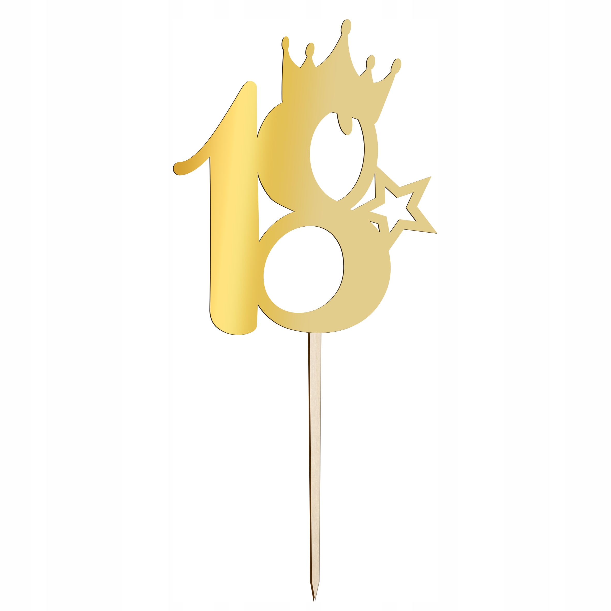 Золотое украшение для торта с цифрой «18» и короной — идеальный способ украсить торт на восемнадцатилетие. Это красивое украшение в виде цифры "18" с короной вверху и звездой справа внизу станет прекрасным дополнением любого торта. Острый конец позволяет легко приклеить украшения к торту. Белый фон добавляет элегантности и делает украшение еще более особенным.