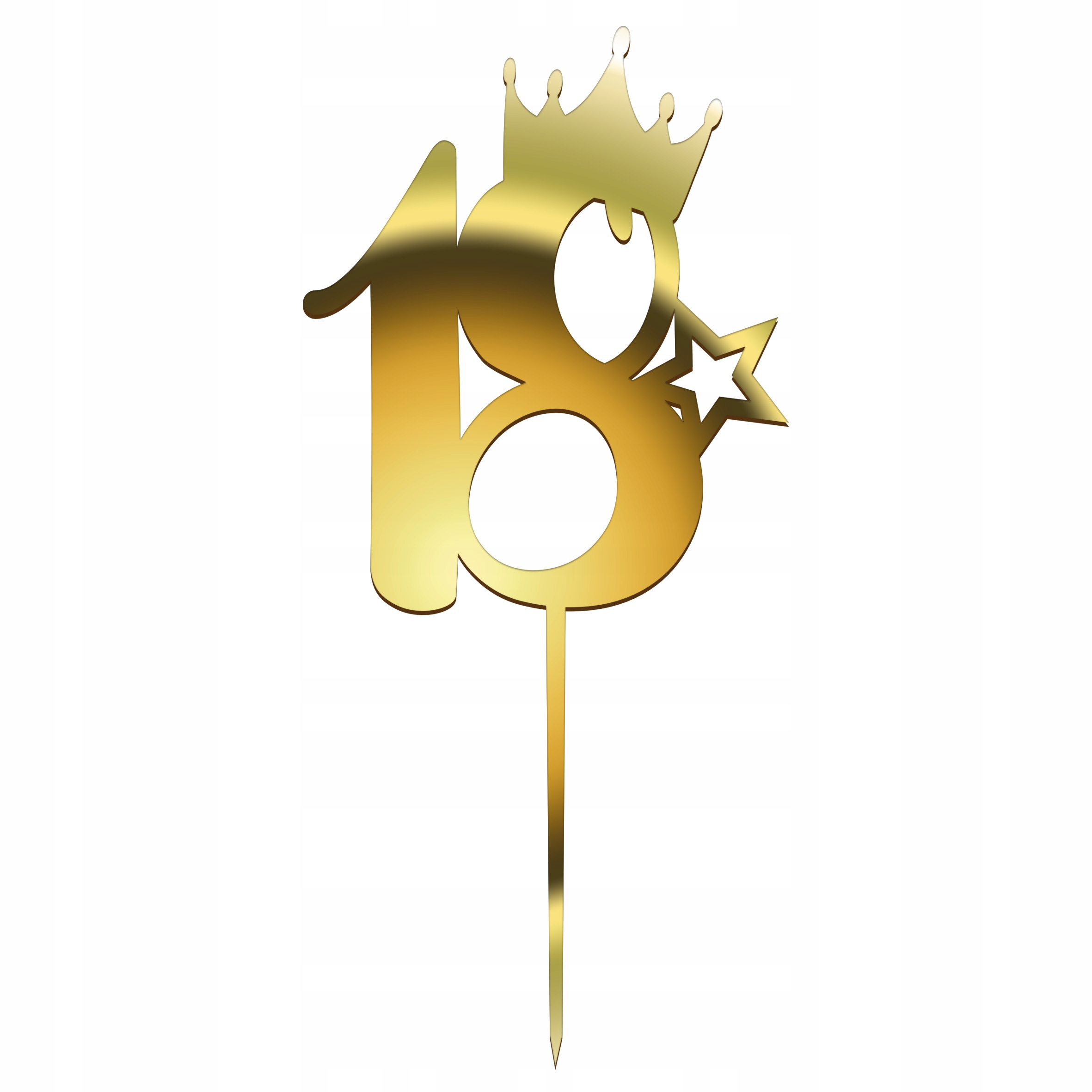 Золотое украшение для торта с цифрой «18» и короной — идеальный способ украсить торт на восемнадцатилетний юбилей. Это красивое украшение в виде цифры "18" с короной вверху и звездой справа внизу станет прекрасным дополнением любого торта. Острый конец позволяет легко приклеить украшения к торту. Белый фон добавляет элегантности и делает украшение еще более особенным.