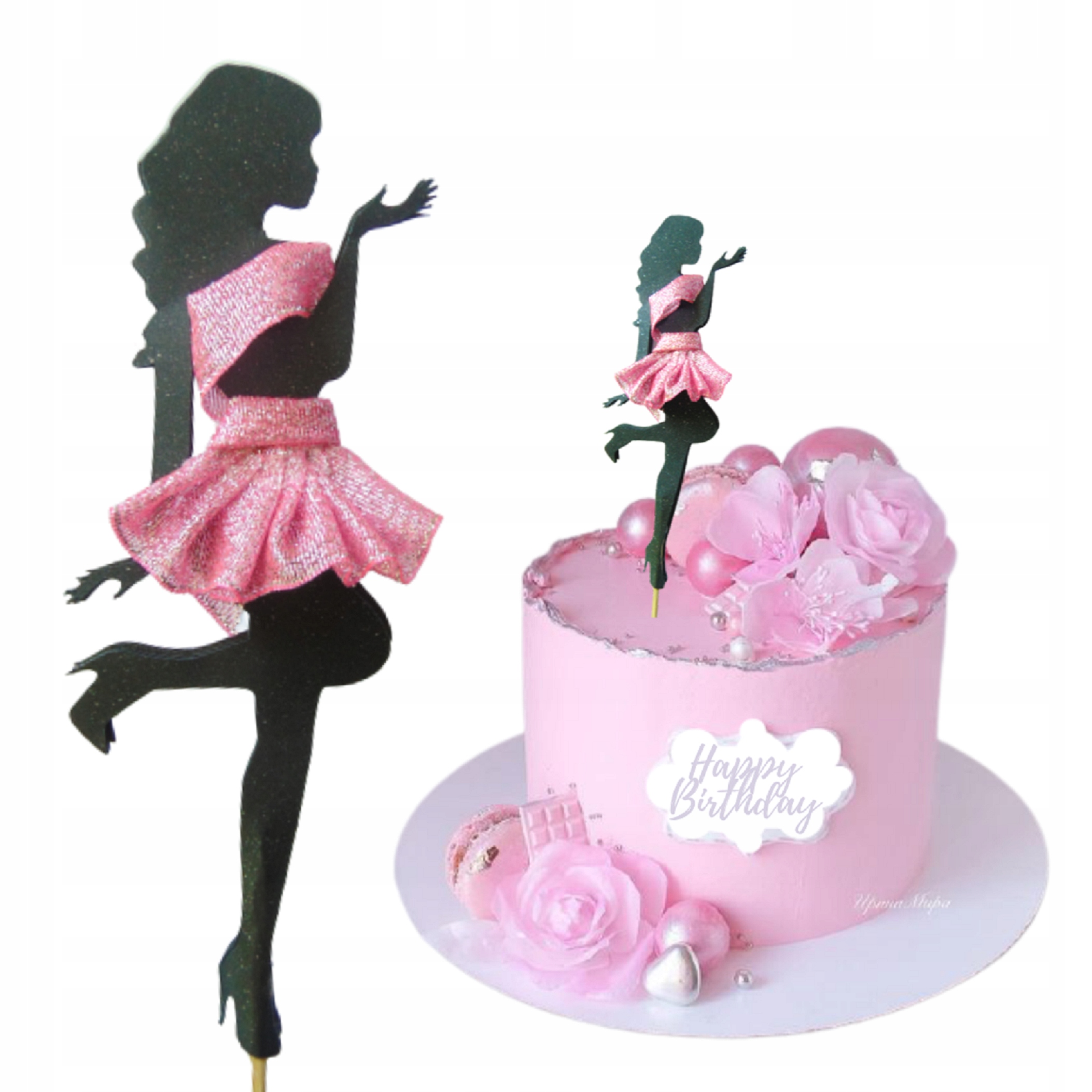 Топпер жесткий, изготовлен из экологически чистой бумаги очень хорошего качества, и если вы поднесете его к свету, то увидите его нежную текстуру. Дополнительно розовое платье с блестками. Блеск не выпадает при выпекании. Интересный акцент для женских тортов или девичников. Также рекомендуем имениннику добавить на топпер цифры, которые вместе украсят праздничный торт.