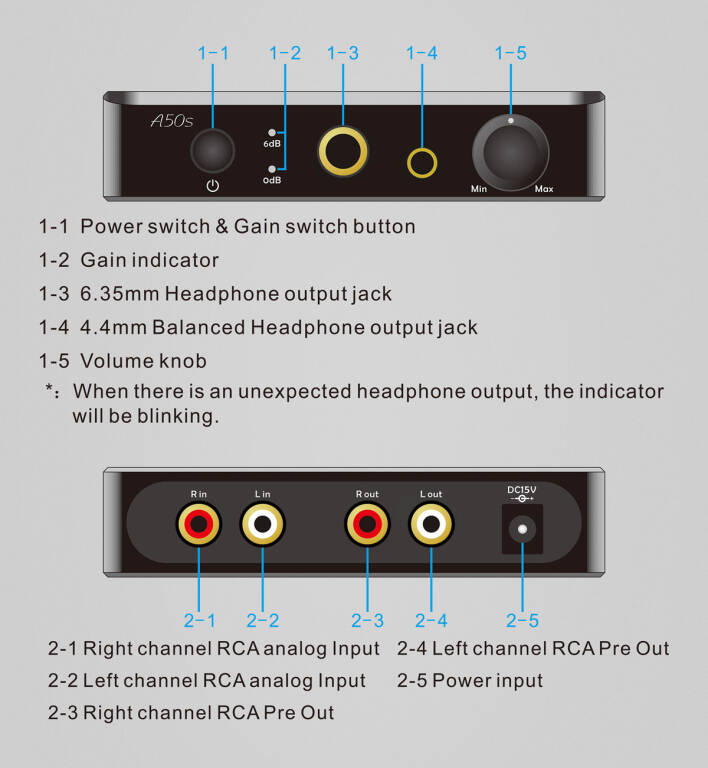 A50s поставляется с двумя настройками усиления: 0 дБ/6 дБ на выходе SE (6 дБ/12 дБ на балансном выходе). Широкий диапазон настроек усиления и сверхнизкий уровень шума 0,3 мкВ (среднеквадратичное значение) позволяют A50 легко адаптироваться ко всем типам наушников: от чрезвычайно чувствительных внутриканальных IEM до самых требовательных полноразмерных наушников.