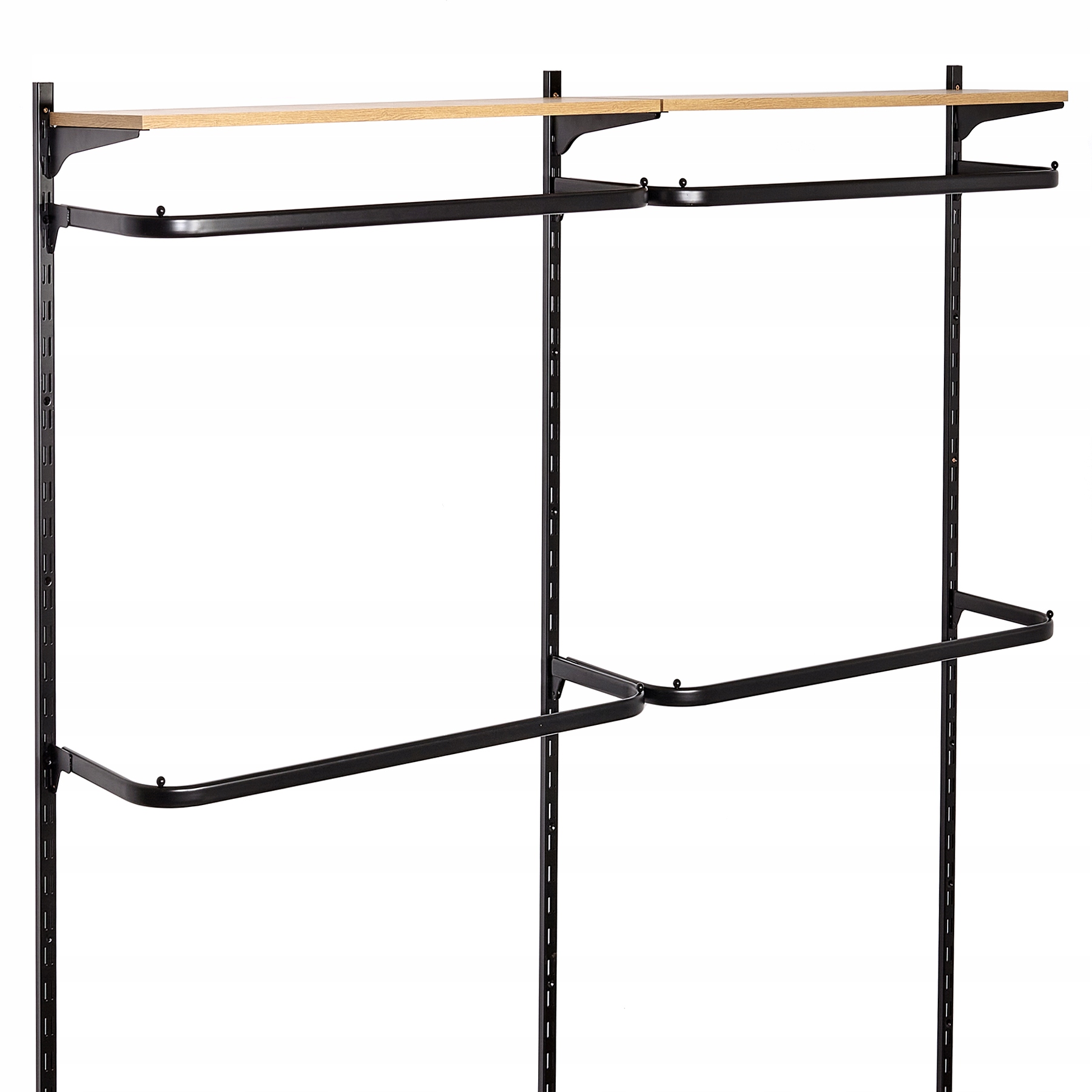 - Материал: Рейка: стальной перфорированный профиль 30х18мм, гр. стенки 2мм; Вешалки, перекладины: стальная труба овального сечения; Кронштейны: сталь; Полка: ламинат толщиной 18мм.